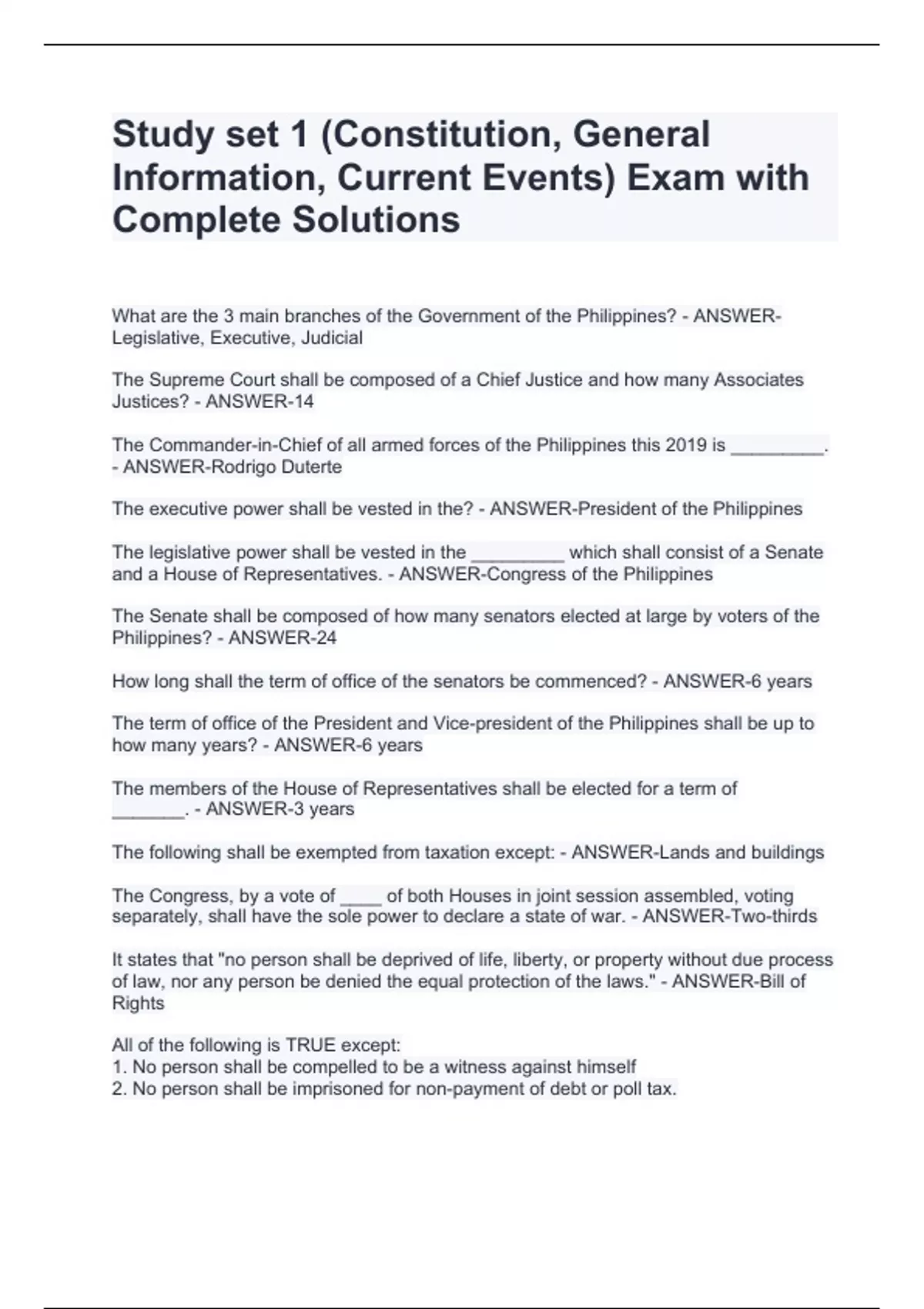 Study set 1 (Constitution, General Information, Current Events) Exam with Complete SolutionsStudy set 1 (Constitution, General Information, Current Events) Exam with Complete SolutionsStudy set 1 (Constitution, General Information, Current Events) Exam with Complete SolutionsStudy set 1 (Constitution, General Information, Current Events) Exam with Complete Solutions What are the 3 main branches of the Government of the Philippines? - ANSWER-Legislative, Executive, Judicial The Supreme Court shall be composed of a Chief Justice and how many Associates Justices? - ANSWER-14 The Commander-in-Chief of all armed forces of the Philippines this 2019 is _________. - ANSWER-Rodrigo Duterte