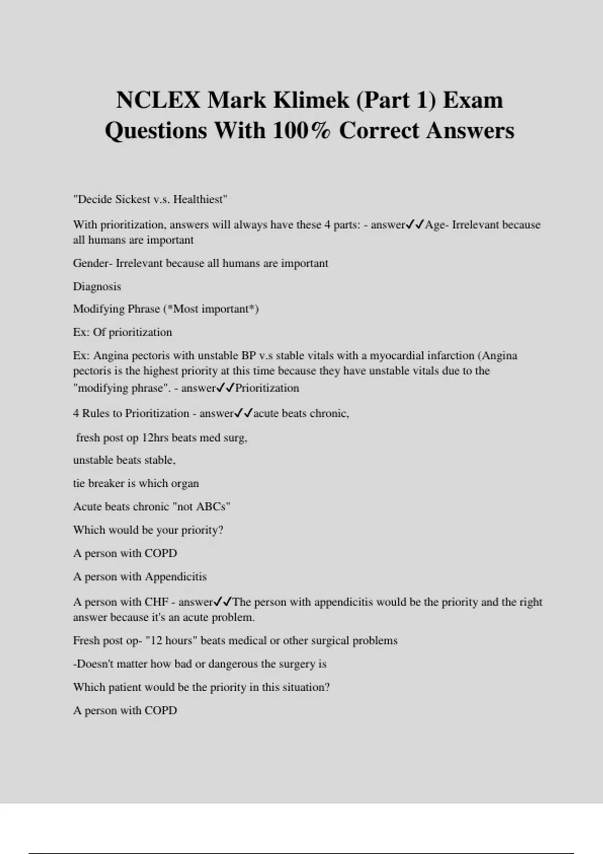 NCLEX Mark Klimek (Part 1) Exam Questions With 100% Correct Answers