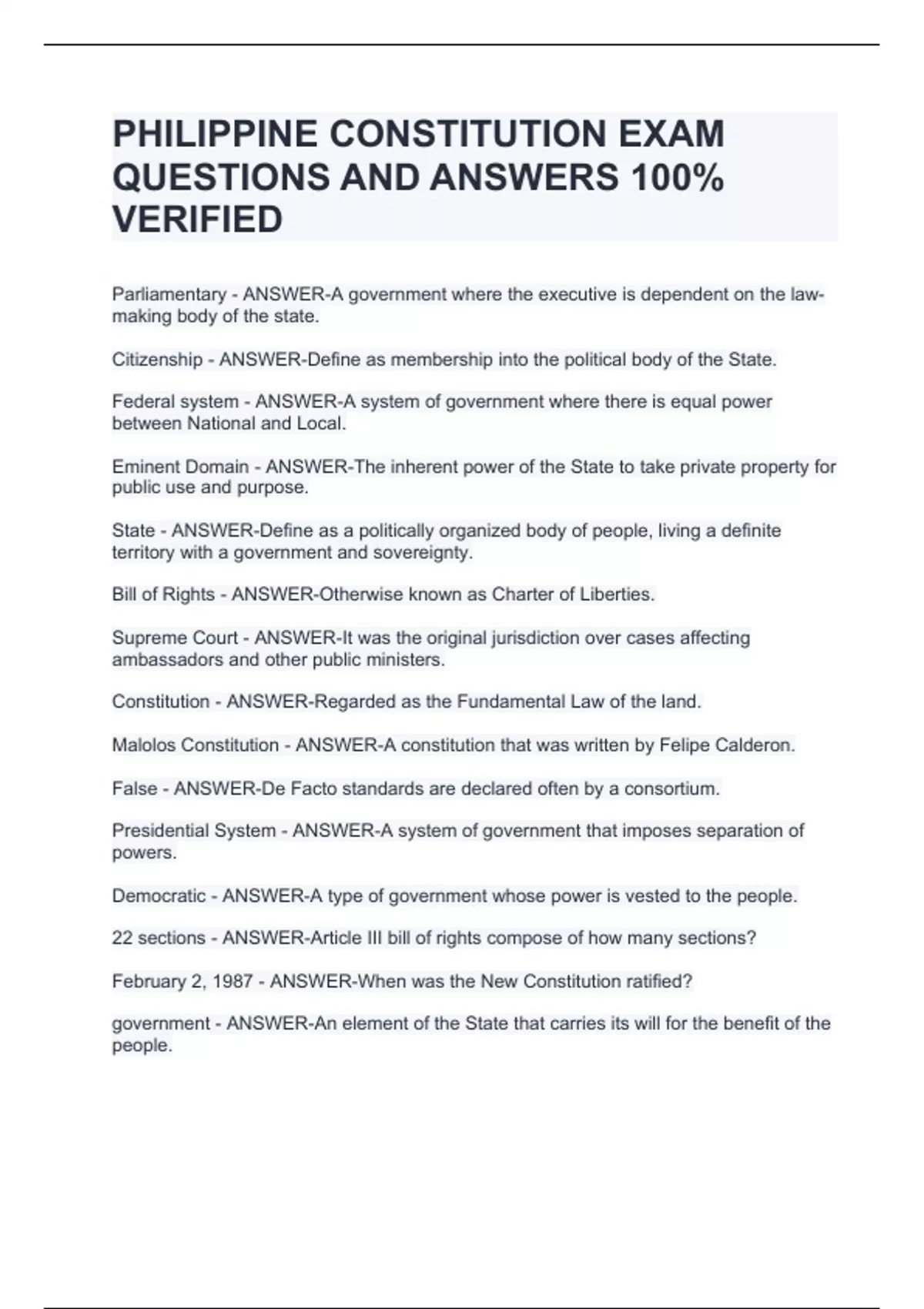 PHILIPPINE CONSTITUTION EXAM QUESTIONS AND ANSWERS 100% VERIFIEDPHILIPPINE CONSTITUTION EXAM QUESTIONS AND ANSWERS 100% VERIFIEDPHILIPPINE CONSTITUTION EXAM QUESTIONS AND ANSWERS 100% VERIFIEDPHILIPPINE CONSTITUTION EXAM QUESTIONS AND ANSWERS 100% VERIFIEDPHILIPPINE CONSTITUTION EXAM QUESTIONS AND ANSWERS 100% VERIFIED Parliamentary - ANSWER-A government where the executive is dependent on the law-making body of the state. Citizenship - ANSWER-Define as membership into the political body of the State. Federal system - ANSWER-A system of government where there is equal power between National and Local.