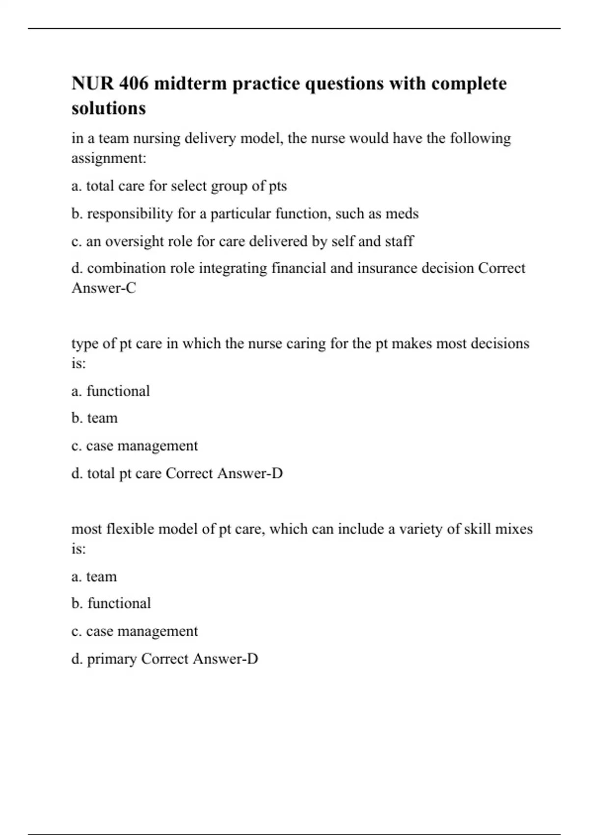 in a team nursing delivery model, the nurse would have the following assignment: a. total care for select group of pts b. responsibility for a particular function, such as meds c. an oversight role for care delivered by self and staff d. combination role integrating financial and insurance decision Correct Answer-C type of pt care in which the nurse caring for the pt makes most decisions is: a. functional b. team c. case management d. total pt care Correct Answer-D most flexible model of pt care, which can include a variety of skill mixes is: a. team b. functional c. case management d. primary Correct Answer-D