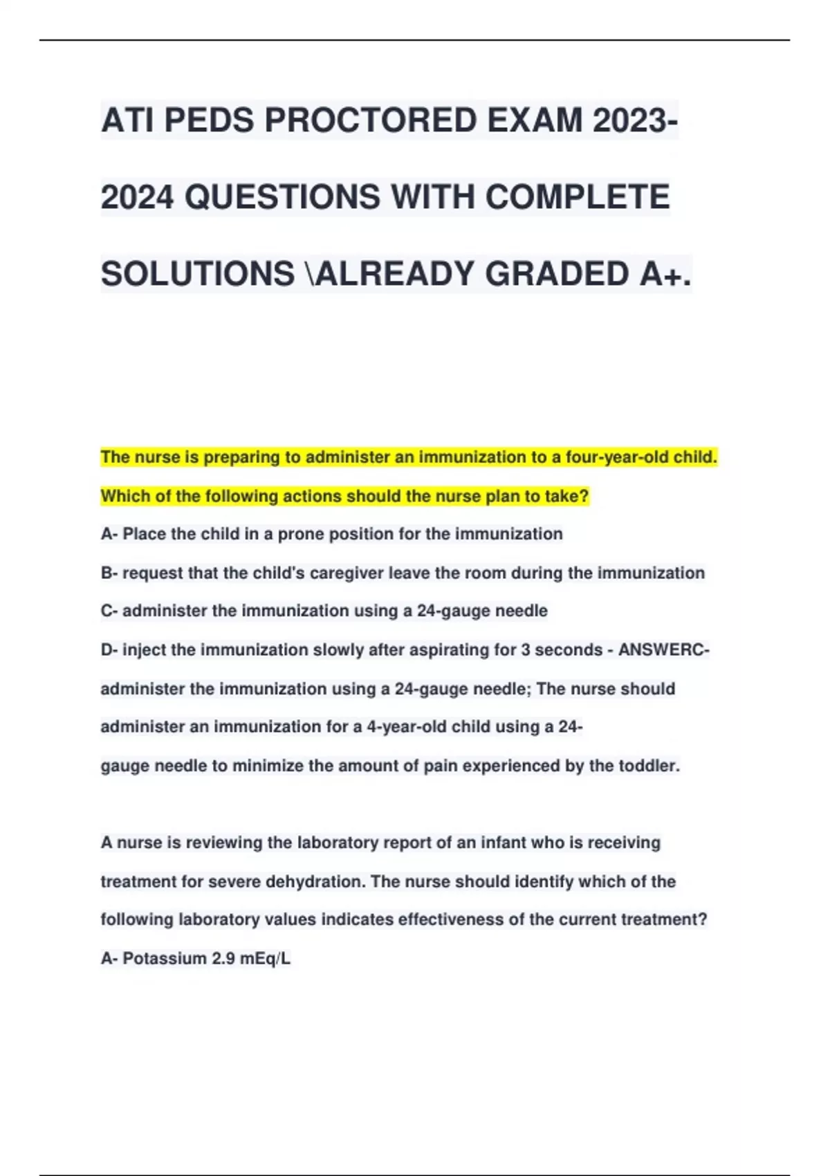 ATI PEDS 2023- 2024QUESTIONS WITH COMPLETE SOLUTIONS ALREADY GRADED A+.