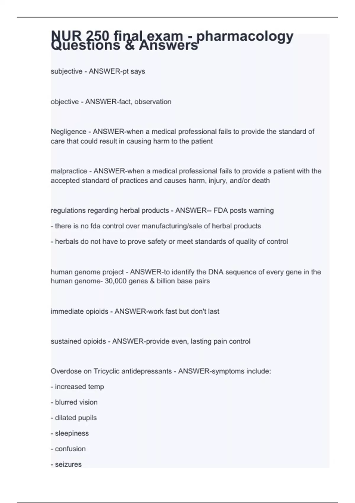 subjective - ANSWER-pt says objective - ANSWER-fact, observation Negligence - ANSWER-when a medical professional fails to provide the standard of care that could result in causing harm to the patient malpractice - ANSWER-when a medical professional fails to provide a patient with the accepted standard of practices and causes harm, injury, and/or death regulations regarding herbal products - ANSWER-- FDA posts warning - there is no fda control over manufacturing/sale of herbal products - herbals do not have to prove safety or meet standards of quality of control human genome project - ANSWER-to identify the DNA sequence of every gene in the human genome- 30,000 genes & billion base pairs immediate opioids - ANSWER-work fast but don't last sustained opioids - ANSWER-provide even, lasting pain control Overdose on Tricyclic antidepressants - ANSWER-symptoms include: - increased temp - blurred vision - dilated pupils - sleepiness