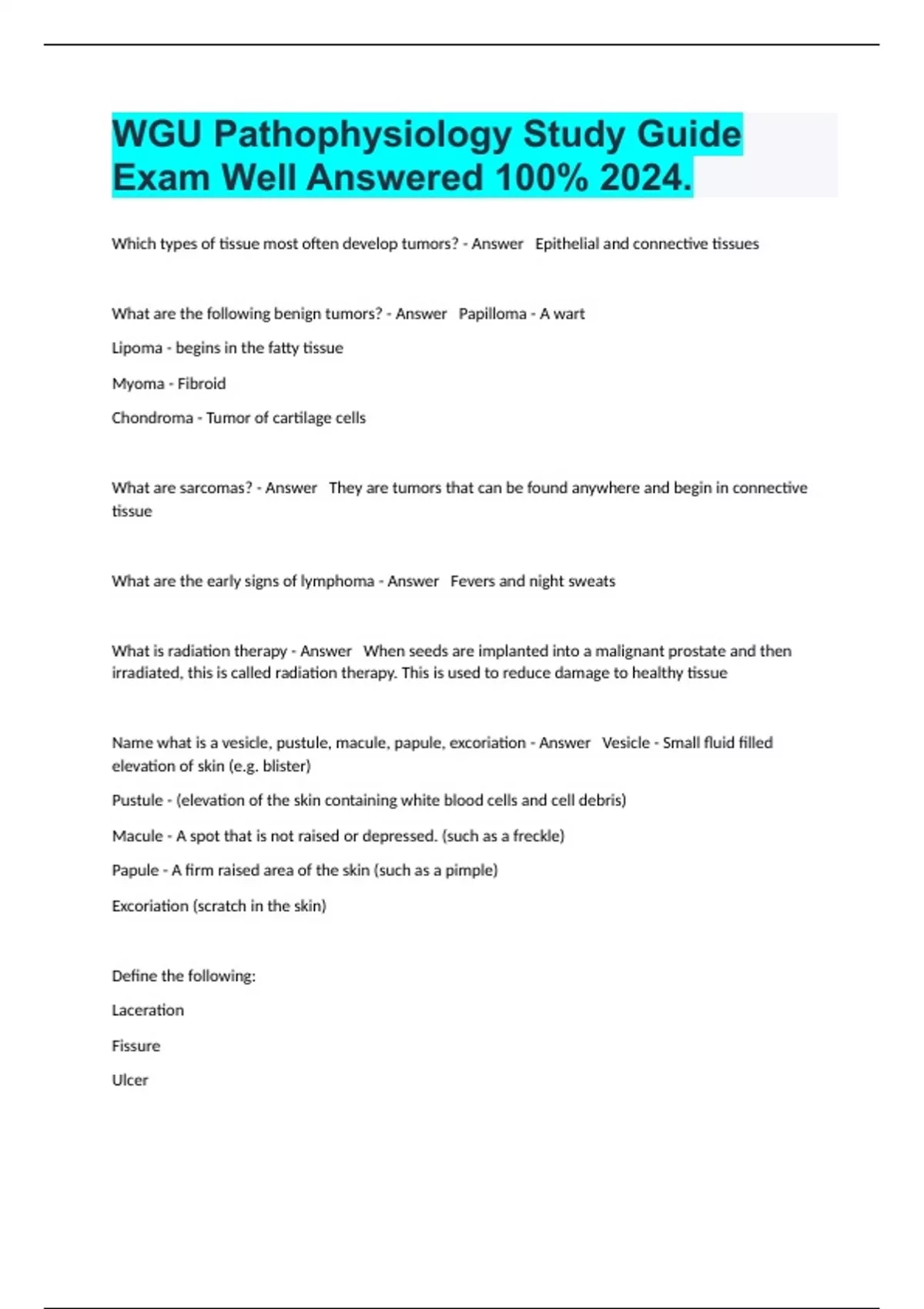 Which types of tissue most often develop tumors? - Answer Epithelial and connective tissues What are the following benign tumors? - Answer Papilloma - A wart Lipoma - begins in the fatty tissue Myoma - Fibroid Chondroma - Tumor of cartilage cells What are sarcomas? - Answer They are tumors that can be found anywhere and begin in connective tissue What are the early signs of lymphoma - Answer Fevers and night sweats What is radiation therapy - Answer When seeds are implanted into a malignant prostate and then irradiated, this is called radiation therapy. This is used to reduce damage to healthy tissue Name what is a vesicle, pustule, macule, papule, excoriation - Answer Vesicle - Small fluid filled elevation of skin (e.g. blister) Pustule - (elevation of the skin containing white blood cells and cell debris) Macule - A spot that is not raised or depressed. (such as a freckle) Papule - A firm raised area of the skin (such as a pimple) Excoriation (scratch in the skin) Define the following: Laceration Fissure Ulcer