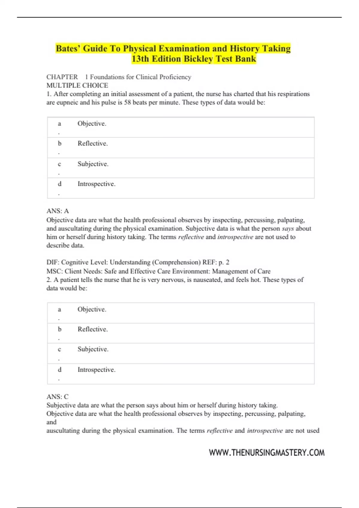 Bates’ Guide To Physical Examination and History Taking 13th Edition Bickley Test Bank CHAPTER 1 Foundations for Clinical Proficiency MULTIPLE CHOICE 1. After completing an initial assessment of a patient, the nurse has charted that his respirations are eupneic and his pulse is 58 beats per minute. These types of data would be: a . Objective. b . Reflective. c . Subjective. d . Introspective. ANS: A Objective data are what the health professional observes by inspecting, percussing, palpating, and auscultating during the physical examination. Subjective data is what the person says about him or herself during history taking. The terms reflective and introspective are not used to describe data. DIF: Cognitive Level: Understanding (Comprehension) REF: p. 2 MSC: Client Needs: Safe and Effective Care Environment: Management of Care 2. A patient tells the nurse that he is very nervous, is nauseated, and feels hot. These types of data would be: a . Objective. b . Reflective. c . Subjective. d . Introspective. ANS: C Subjective data are what the person says about him or herself during history taking. Objective data are what the health professional observes by inspecting, percussing, palpating, and auscultating during the physical examination. The terms reflective and introspective are not used