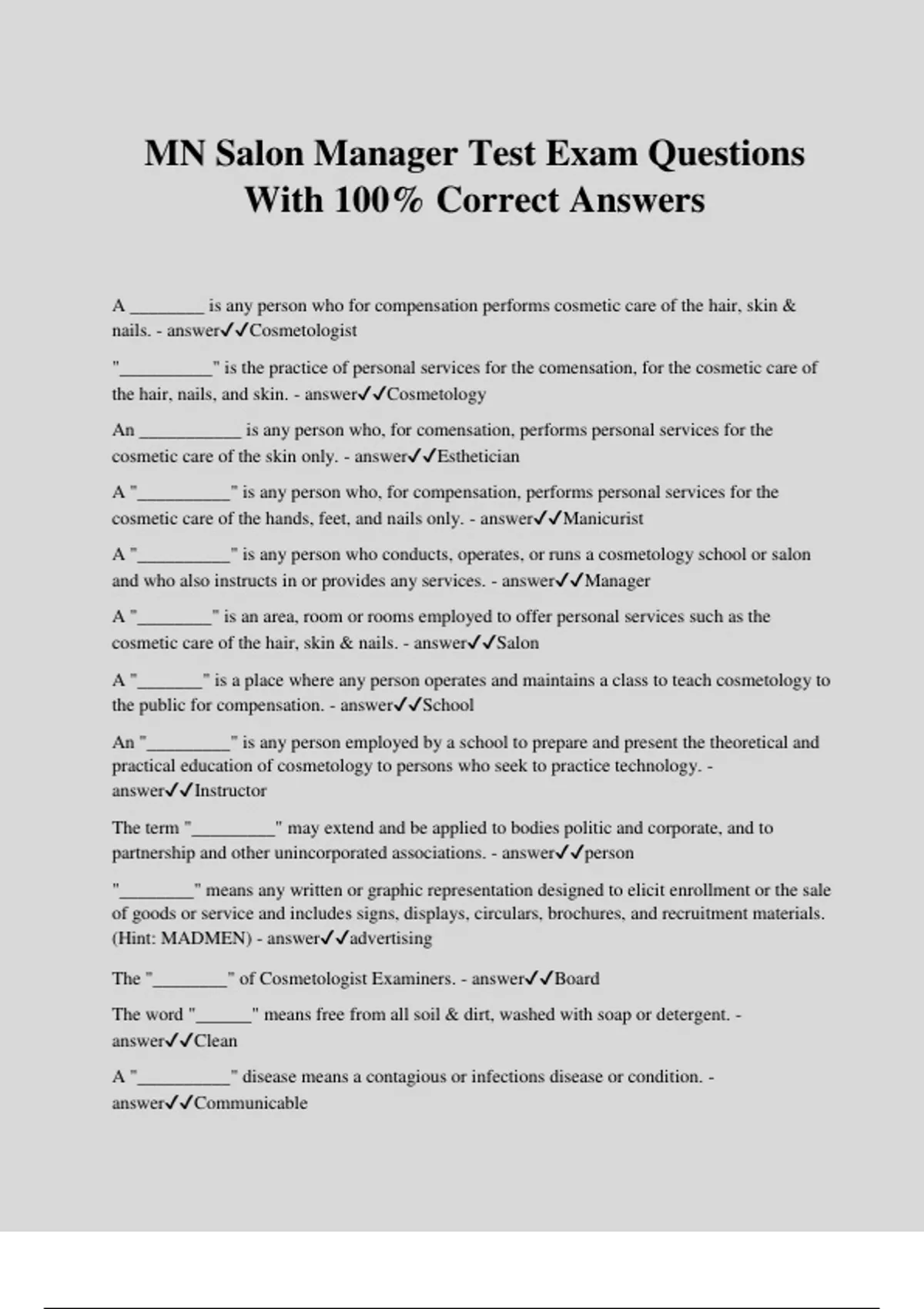 MN Salon Manager Test Exam Questions With 100% Correct Answers A ________ is any person who for compensation performs cosmetic care of the hair, skin & nails. - answerCosmetologist "__________" is the practice of personal services for the comensation, for the cosmetic care of the hair, nails, and skin. - answerCosmetology An ___________ is any person who, for comensation, performs personal services for the cosmetic care of the skin only. - answerEsthetician A "__________" is any person who, for compensation, performs personal services for the cosmetic care of the hands, feet, and nails only. - answerManicurist A "__________" is any person who conducts, operates, or runs a cosmetology school or salon and who also instructs in or provides any services. - answerManager A "________" is an area, room or rooms employed to offer personal services such as the cosmetic care of the hair, skin & nails. - answerSalon A "_______" is a place where any person operates and maintains a class to teach cosmetology to the public for compensation. - answerSchool An "_________" is any person employed by a school to prepare and present the theoretical and practical education of cosmetology to persons who seek to practice technology. - answerInstructor The term "_________" may extend and be applied to bodies politic and corporate, and to partnership and other unincorporated associations. - answerperson "________" means any written or graphic representation designed to elicit enrollment or the sale of goods or service and includes signs, displays, circulars, brochures, and recruitment materials. (Hint: MADMEN) - answeradvertising The "________" of Cosmetologist Examiners. - answerBoard The word "______" means free from all soil & dirt, washed with soap or detergent. - answerClean A "__________" disease means a contagious or infections disease or condition. - answerCommunicable A physical location or area in a salon that is primarily where cosmetology supplies, products, or chemicals are prepared, measured, mixed, portioned, or disposed of..... - answerDispensary Hair "_________" is the natural form of hair manipulation that results in tension on hair strands shaped into a variety of patters & textures. - answerHair Braiding LIcensing in each classifcation shall be for a period of two years. A.True B.False - answerFalse A nonresident cosmetologist may be lisenced in Minnesota if the indiviual has completed cosmetology school in a state witth the same or greater school hour requirements, has a active license in that state or country, and has passed the Minnesota specific writtern operator examination for cosmetologist. A.True B.False - answerTrue To receive licensed reciprocity with other jurisdictions what is the licensee NOT required to do... A.Successful complete a written exam B.Provide evidence of completion in appropriate refresher course C.Go back to cosmetology school for 800 more hours D.Have a cosmetology license. - answerC No Salon shall operate without a... - answerlicense No cosmo service shall be provided in a place other than a licensed salon - answerlocation No salon shall employ or allow ______ persons to perform any cosmo service - answerunlicensed A salon License can be _____ if not replied for within 60 days for change of ownership or location - answerterminate A salon owner must notify board with 60 days if they - answerchange their name The salon owner & designated manager appointed in writting by the owner are responsible for the salon...... - answerat all times Only _____ person/people shall be sidignated as a manager for each salon. No manger may be concurrently responsible for more than one salon unless the salons are under the same owndership and all located in the same complex. - answer1