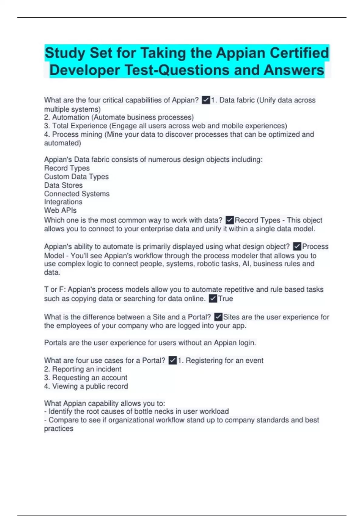 What are the four critical capabilities of Appian? 1. Data fabric (Unify data across multiple systems) 2. Automation (Automate business processes) 3. Total Experience (Engage all users across web and mobile experiences) 4. Process mining (Mine your data to discover processes that can be optimized and automated) Appian's Data fabric consists of numerous design objects including: Record Types Custom Data Types Data Stores Connected Systems Integrations Web APIs Which one is the most common way to work with data? Record Types - This object allows you to connect to your enterprise data and unify it within a single data model. Appian's ability to automate is primarily displayed using what design object? Process Model - You'll see Appian's workflow through the process modeler that allows you to use complex logic to connect people, systems, robotic tasks, AI, business rules and data. T or F: Appian's process models allow you to automate repetitive and rule based tasks such as copying data or searching for data online. True What is the difference between a Site and a Portal? Sites are the user experience for the employees of your company who are logged into your app. Portals are the user experience for users without an Appian login. What are four use cases for a Portal? 1. Registering for an event 2. Reporting an incident 3. Requesting an account 4. Viewing a public record What Appian capability allows you to: - Identify the root causes of bottle necks in user workload - Compare to see if organizational workflow stand up to company standards and best practices - Assess target performance of APIs Process Mining What is the key benefit of Appian's data fabric? It connects and unifies your data within a single data model. What Appian feature allows you to automate complex business workflows? Process modeler What does "total experience" refer to? (Select 4) A. It engages all users B. It is responsive by default C. It allows you to sell goods and services D. It is secure by default E. It can be built using low-code tools A, B, D, E
