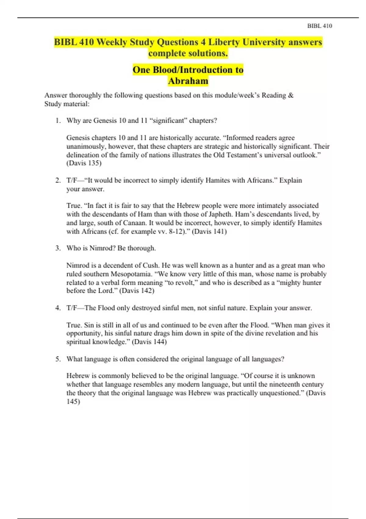 BIBL 410 Weekly Study Questions 4 Liberty University answers complete solutions. One Blood/Introduction to Abraham Answer thoroughly the following questions based on this module/week’s Reading & Study material: 1. Why are Genesis 10 and 11 “significant” chapters? Genesis chapters 10 and 11 are historically accurate. “Informed readers agree unanimously, however, that these chapters are strategic and historically significant. Their delineation of the family of nations illustrates the Old Testament’s universal outlook.” (Davis 135) 2. T/F—“It would be incorrect to simply identify Hamites with Africans.” Explain your answer. True. “In fact it is fair to say that the Hebrew people were more intimately associated with the descendants of Ham than with those of Japheth. Ham’s descendants lived, by and large, south of Canaan. It would be incorrect, however, to simply identify Hamites with Africans (cf. for example vv. 8-12).” (Davis 141) 3. Who is Nimrod? Be thorough. Nimrod is a decendent of Cush. He was well known as a hunter and as a great man who ruled southern Mesopotamia. “We know very little of this man, whose name is probably related to a verbal form meaning “to revolt,” and who is described as a “mighty hunter before the Lord.” (Davis 142) 4. T/F—The Flood only destroyed sinful men, not sinful nature. Explain your answer. True. Sin is still in all of us and continued to be even after the Flood. “When man gives it opportunity, his sinful nature drags him down in spite of the divine revelation and his spiritual knowledge.” (Davis 144)