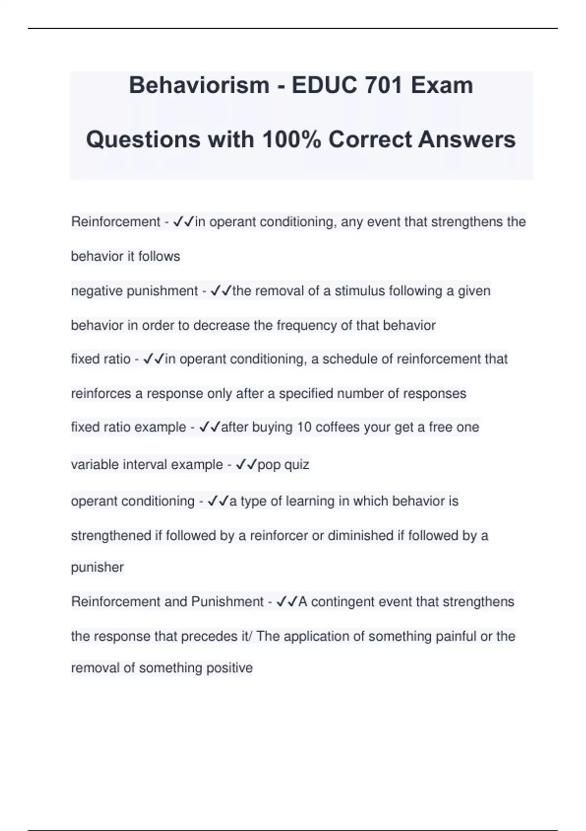 Behaviorism - EDUC 701 Exam Questions with 100% Correct Answers Reinforcement - in operant conditioning, any event that strengthens the behavior it follows negative punishment - the removal of a stimulus following a given behavior in order to decrease the frequency of that behavior fixed ratio - in operant conditioning, a schedule of reinforcement that reinforces a response only after a specified number of responses fixed ratio example - after buying 10 coffees your get a free one variable interval example - pop quiz operant conditioning - a type of learning in which behavior is strengthened if followed by a reinforcer or diminished if followed by a punisher Reinforcement and Punishment - A contingent event that strengthens the response that precedes it/ The application of something painful or the removal of something positive