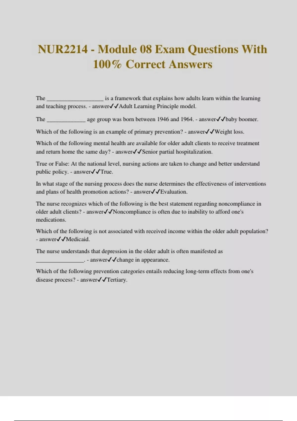 NUR2214 - Module 08 Exam Questions With 100% Correct Answers The ___________________ is a framework that explains how adults learn within the learning and teaching process. - answerAdult Learning Principle model. The _____________ age group was born between 1946 and 1964. - answerbaby boomer. Which of the following is an example of primary prevention? - answerWeight loss. Which of the following mental health are available for older adult clients to receive treatment and return home the same day? - answerSenior partial hospitalization.