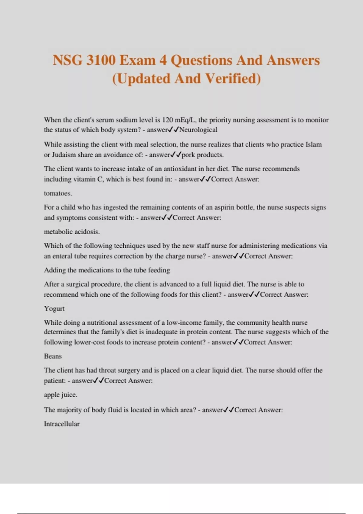 NSG 3100 Exam 4 Questions And Answers (Updated And Verified) When the client's serum sodium level is 120 mEq/L, the priority nursing assessment is to monitor the status of which body system? - answerNeurological While assisting the client with meal selection, the nurse realizes that clients who practice Islam or Judaism share an avoidance of: - answerpork products. The client wants to increase intake of an antioxidant in her diet. The nurse recommends including vitamin C, which is best found in: - answerCorrect Answer: tomatoes. For a child who has ingested the remaining contents of an aspirin bottle, the nurse suspects signs and symptoms consistent with: - answerCorrect Answer: metabolic acidosis. Which of the following techniques used by the new staff nurse for administering medications via an enteral tube requires correction by the charge nurse? - answerCorrect Answer: Adding the medications to the tube feeding After a surgical procedure, the client is advanced to a full liquid diet. The nurse is able to recommend which one of the following foods for this client? - answerCorrect Answer: Yogurt While doing a nutritional assessment of a low-income family, the community health nurse determines that the family's diet is inadequate in protein content. The nurse suggests which of the following lower-cost foods to increase protein content? - answerCorrect Answer: Beans The client has had throat surgery and is placed on a clear liquid diet. The nurse should offer the patient: - answerCorrect Answer: apple juice. The majority of body fluid is located in which area? - answerCorrect Answer: Intracellular The nurse recognizes that the client, on the basis of the imbalance that is present, will require fluid replacement with isotonic solution. One of the isotonic solutions that may be ordered by the physician is: - answerCorrect Answer: Lactated Ringer solution. One of the first indications of fluid volume deficit is: - answerCorrect Answer: tachycardia. For the client with a vitamin D deficiency and inadequate calcium intake, the nurse observes for: - answerCorrect Answer: Chvostek sign Chvostek sign - answeran abnormal reaction to the stimulation of the facial nerve. A nasogastric tube is inserted in order for the client to receive intermittent tube feedings. The action by the nurse that requires correction by the unit manager is: - answerCorrect Answer: instilling air into the NG tube to check for placement. The mucous membranes of a normally hydrated individual are: - answerCorrect Answer: moist. Of the following clients, the nurse recognizes that the individual who is most at risk for a fluid volume deficit is: - answerCorrect Answer: 42-year-old with severe vomiting. The single best indicator of fluid status is the nurse's assessment of the client's: - answerCorrect Answer: daily body weight The nurse is inserting a nasogastric tube. During the insertion, the client starts to gag and becomes dyspneic. Which action should the nurse take? - answerCorrect Answer: Withdraw the tube and start again. It is recommended that adults consume approximately how much of their diet from carbohydrates? - answerCorrect Answer: 50% A critical measure for clients with hypocalcemia and hypomagnesemia is: - answerCorrect Answer: implementing seizure precautions.