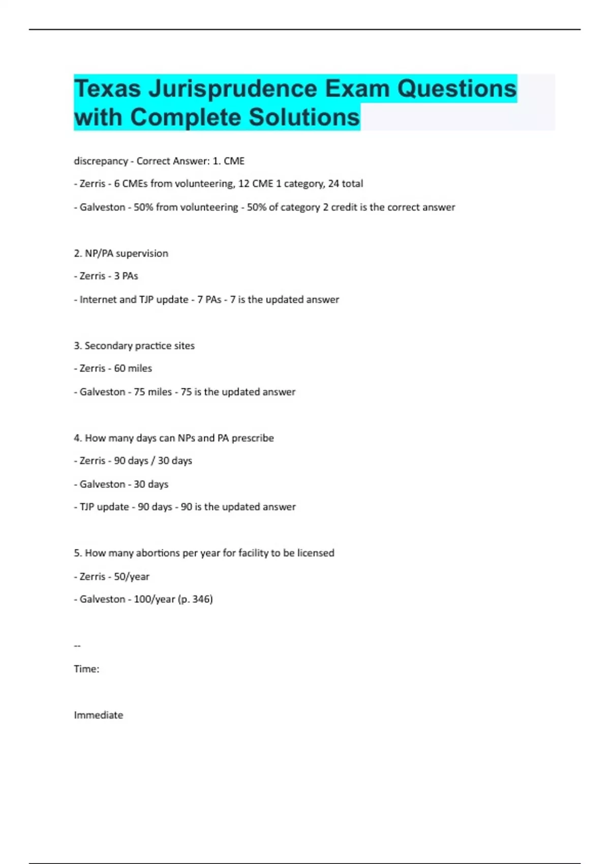 discrepancy - Correct Answer: 1. CME - Zerris - 6 CMEs from volunteering, 12 CME 1 category, 24 total - Galveston - 50% from volunteering - 50% of category 2 credit is the correct answer 2. NP/PA supervision - Zerris - 3 PAs - Internet and TJP update - 7 PAs - 7 is the updated answer 3. Secondary practice sites - Zerris - 60 miles - Galveston - 75 miles - 75 is the updated answer 4. How many days can NPs and PA prescribe - Zerris - 90 days / 30 days - Galveston - 30 days - TJP update - 90 days - 90 is the updated answer 5. How many abortions per year for facility to be licensed - Zerris - 50/year - Galveston - 100/year (p. 346) -- Time: Immediate -Verbal report abuse (professionals/nonprofessionals; professionals have 48 hours for written report) -Report to State Dept re: anthrax, botulism, cholera, smallpox, diphtheria, rabies, polio, plague, typhus, yellow fever - "outbreak" diagnoses (1 day for tb/pertussis) -Gunshot and overdose reports -Notify DFPS about abandoned infant 1 hour -Time to evaluate restrained patient as to need for restraints 4 hours -Time to spend looking for next of kin with organ donation -Time within which to notify MD of MHIP discharge request and after which MD must examine w/i 24hrs 24 hours -Department of Protective Regulatory Services investigates report of suspected child/elder abuse -Notice to pt re: impending abortion -Time to evaluate non restrained patient for involuntary POC/court ordered (12/48 for initial assessment/eval of need if just MD and involuntary) mental health admission; have till 72 hours for probable cause, no longer than 90 days total -Inform re: pertussis and tb -<24 h death of nursing home resident after xfer to hospital has to be reported -Inform mental health pt of rights (72 h for written bill of rights) 48 hours -Notice to parents of minor re: impending abortion -After emergency deten - Correct Answer: NOt available 10$ The Texas Medical Jurisprudence Exam: A Concise Review by Ben White T offers ten free practice questions on their site, which I also went through four times. I did not buy the course, and I don't think it's necessary to do this - just as a matter of principle, I have to object to spending three times as much on a prep course compared to the test fee. For practice questions, I used a new TX Medical Jurisprudence Exam practice question app, which offers 234 questions for $10. You can buy the app on Amazon or through the Apple App Store. I took a bit of a risk on buying this resource since there were no reviews on Amazon or on Apple (the app just came out a couple of months ago), but I think it fills a niche for people like me who want to have quality practice questions at a reasonable price. The questions were very representative of the real exam, and I went through them four times as well. If you're going to use this resource, make sure you're buying the physician version for $10, not the PA version (which was a few dollars cheaper). There is also a study guide app written by the same author, which I didn't buy after seeing several reviews that said it was essentially compiled from the Ben White book and flash card set mentioned above. SDN - I skimmed through the times and crimes listed in the first post in this thread the morning of the test. It's a good review, but it is way more detailed than what you need to know for the test. 1. The Texas Medical Jurisprudence Exam: A Concise Review by Ben White- read it 1 time thoroughly and slowly to try to understand it, and then skimmed through it 2x after that 2. TX Medical Jurisprudence Exam practice question app, 234 questions- did it the first time slowly and read all explanations, cleared all answers and retried all questio Can a patient successfully sue a doctor if there is no physician-patient relationship? - Correct Answer: No If there is no prior physician-patient relationship, are you legally obliged to respond to a call from a patient for treatment? - Correct Answer: No Does being on call give rise to a physician-patient relationship? - Correct Answer: No How can one terminate a physician-patient relationship, without abandonment if there is ongoing treatment? - Correct Answer: 30 days written notice; must provide for emergency Does a physician's duty extend to the unborn child or potential victims of an ill patient? - Correct Answer: Yes What is "proximate cause"? - Correct Answer: Prove that negligence caused harm and that the cause was not too remote; what is required to hold a defendant liable in a civil lawsuit What are the two components of proximate cause? - Correct Answer: Cause-in-fact (but-for test) and foreseeability Does an expert witness have to be actively practicing medicine? - Correct Answer: Yes Does an expert witness have to know standards of care? - Correct Answer: Yes Does an expert witness have to have enough training to express an opinion on whether standard of care was provided? - Correct Answer: Yes Does an expert witness have to be board certified? - Correct Answer: No, board certified or eqivalent In a medical malpractice case, are expert witnesses required? - Correct Answer: Yes, with two exceptions In a medical malpractice setting, what 2 instances do not need expert testimony? - Correct Answer: Res ipsa loquitur (e.g., amputation of wrong leg) and negligence per se (a law was broken) What are "exemplary damages"? - Correct Answer: Damages above compensatory designed to punish the defendant and deter the behavior Is there a cap to noneconomic damages? How much? - Correct Answer: $250,000 for physicians, $500,000 for hospitals Does the cap on noneconomic damage depend on the number of defendants or claimants? - Correct Answer: No What is "proportional responsibility"? - Correct Answer: Percentage of liability apportioned according to percentage of fault Can the claimant have part of the proportional responsibility? - Correct Answer: Yes If the claimant's proportionate responsibility is more than what %, he/she may not recover damages? - Co