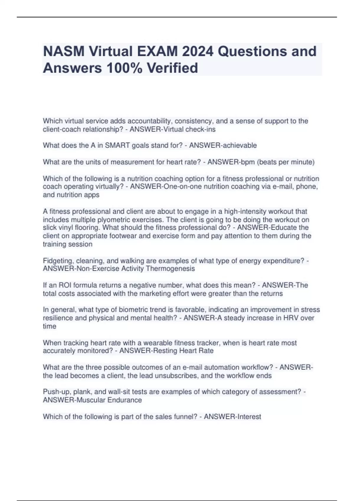 Which virtual service adds accountability, consistency, and a sense of support to the client-coach relationship? - ANSWER-Virtual check-ins What does the A in SMART goals stand for? - ANSWER-achievable What are the units of measurement for heart rate? - ANSWER-bpm (beats per minute) Which of the following is a nutrition coaching option for a fitness professional or nutrition coach operating virtually? - ANSWER-One-on-one nutrition coaching via e-mail, phone, and nutrition apps A fitness professional and client are about to engage in a high-intensity workout that includes multiple plyometric exercises. The client is going to be doing the workout on slick vinyl flooring. What should the fitness professional do? - ANSWER-Educate the client on appropriate footwear and exercise form and pay attention to them during the training session Fidgeting, cleaning, and walking are examples of what type of energy expenditure? - ANSWER-Non-Exercise Activity Thermogenesis If an ROI formula returns a negative number, what does this mean? - ANSWER-The total costs associated with the marketing effort were greater than the returns In general, what type of biometric trend is favorable, indicating an improvement in stress resilience and physical and mental health? - ANSWER-A steady increase in HRV over time When tracking heart rate with a wearable fitness tracker, when is heart rate most accurately monitored? - ANSWER-Resting Heart Rate What are the three possible outcomes of an e-mail automation workflow? - ANSWERthe lead becomes a client, the lead unsubscribes, and the workflow ends Push-up, plank, and wall-sit tests are examples of which category of assessment? - ANSWER-Muscular Endurance Which of the following is part of the sales funnel? - ANSWER-Interest In order to provide effective virtual coaching, fitness professionals must understand how to gauge and measure what? - ANSWER-Client Engagement What should a fitness professional always do when going through a client's check-in? - ANSWER-Take Notes Which dietary assessment forms should be utilized by fitness professionals? - ANSWER-All, some, or none based on qualifications and expertise For pushing and pulling assessments, a resistance band should be chosen based on the client's ability to perform a minimum of how many repetitions? - ANSWER-20 What is the average amount of sleep an American gets each night? - ANSWER-6 hours and 40 min Which of the following is an example of a solopreneur? - ANSWER-An entrepreneur who runs a business on their own, with no employees
