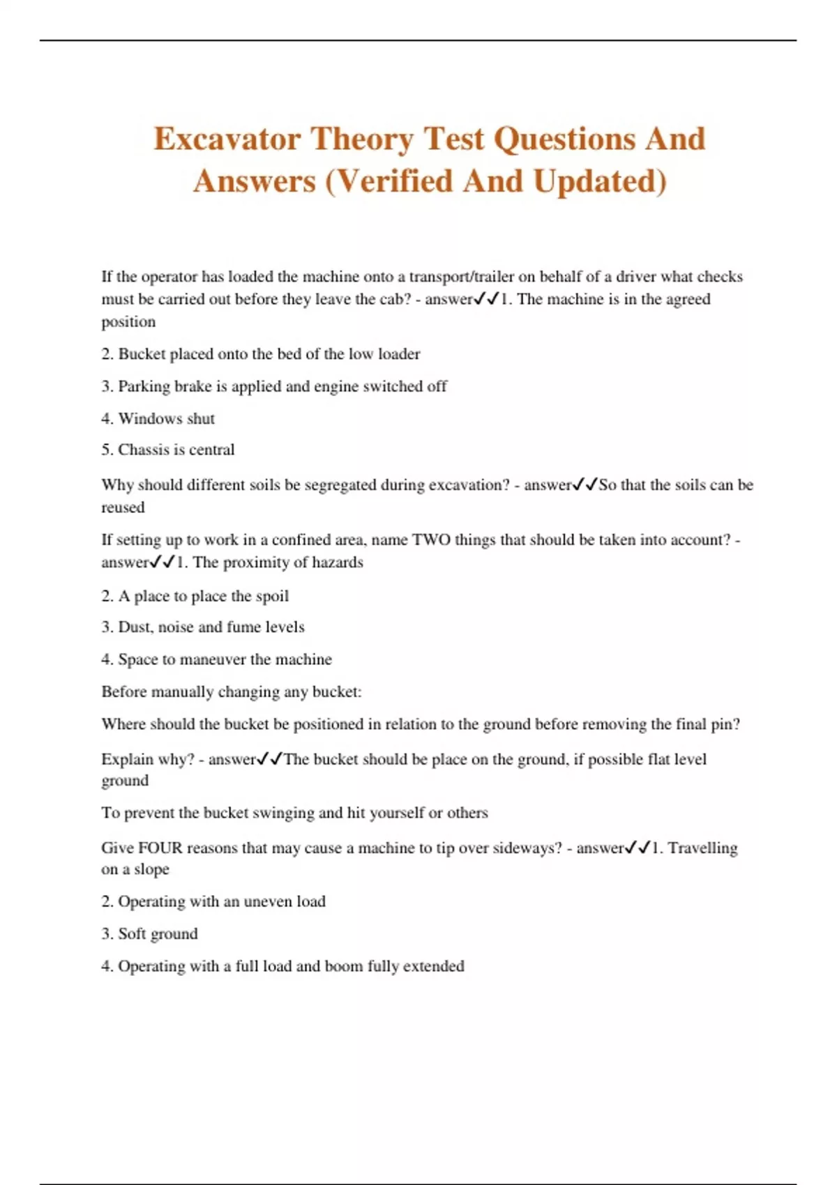 Excavator Theory Test Questions And Answers (Verified And Updated) If the operator has loaded the machine onto a transport/trailer on behalf of a driver what checks must be carried out before they leave the cab? - answer1. The machine is in the agreed position 2. Bucket placed onto the bed of the low loader 3. Parking brake is applied and engine switched off 4. Windows shut 5. Chassis is central Why should different soils be segregated during excavation? - answerSo that the soils can be reused If setting up to work in a confined area, name TWO things that should be taken into account? - answer1. The proximity of hazards 2. A place to place the spoil 3. Dust, noise and fume levels 4. Space to maneuver the machine Before manually changing any bucket: Where should the bucket be positioned in relation to the ground before removing the final pin? Explain why? - answerThe bucket should be place on the ground, if possible flat level ground To prevent the bucket swinging and hit yourself or others Give FOUR reasons that may cause a machine to tip over sideways? - answer1. Travelling on a slope 2. Operating with an uneven load 3. Soft ground 4. Operating with a full load and boom fully extended When must a banks-man/signaler be used before moving an excavator? - answerIn any situation when the Operator cannot see the direction of travel What needs to be inspected on a quick hitch coupler when attaching lifting accessories to lift slung loads? - answerlocking system engaged correct position appropriate size and weight for attachment Before lowering into or moving a drag box in a trench, what trench related checks must be made? - answerMust check that all personal are clear from the trench Where should the excavators operators manual be kept and why? - answerInside the Machine to ensure easy access for all operators of the machine If the excavator is carrying out deep excavating work using the full working range, what hazards may occur - answerMay cause it's self to tip into the trench May excavate beneath the machine its self With regards to lifting accessories, irrespective of who supplied the accessories , what THREE factors should be ensured before the accessories are used? - answer1. Accessories have certificates 2. The correct accessory is being used for the load 3. The accessory has been serviced 4. No cracks or damage to the accessory When an object needs to be lifted on a site, what should be the first consideration of planning? - answerplanning the lifting operation by an authorized, appointed person Why must the controls be isolated before each load can be attached or disconnected by the singer? - answerTo avoid injury to the slinger through accidental operation of the controls Give two examples of where the working at height Regulations may apply to excavators? - answer1. Getting in and out of the machine 2. checking the engine oil levels Why should the excavator be re-fueled at the end of the day? - answerTo prevent condensation building up inside the fuel tank as it cools down The operator has to fit and use a new bucket using a quick hitch coupler that they are unfamiliar with what do regulations and other guidance require the operator to have - answerThat they have sufficient: • Information