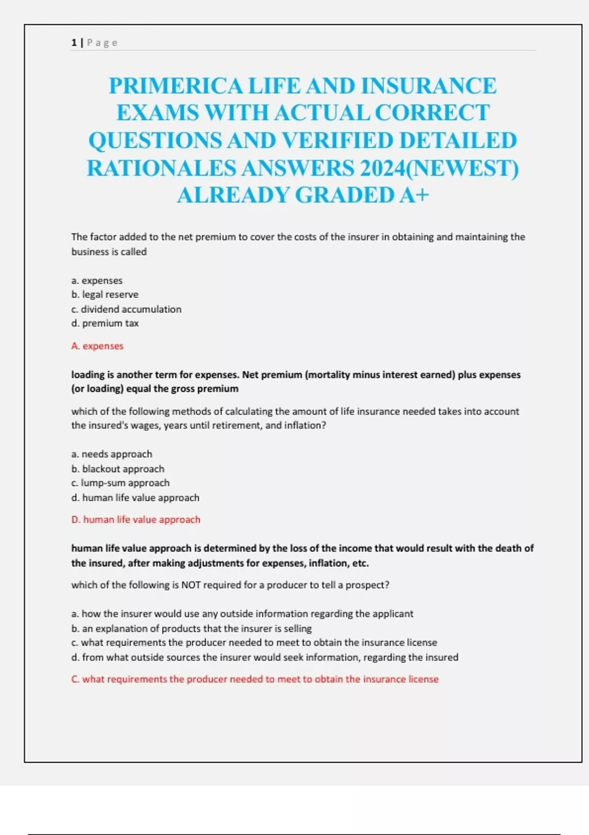 PRIMERICA LIFE AND INSURANCE EXAMS WITH ACTUAL CORRECT QUESTIONS AND VERIFIED DETAILED RATIONALES ANSWERS 2024(NEWEST) ALREADY GRADED A+