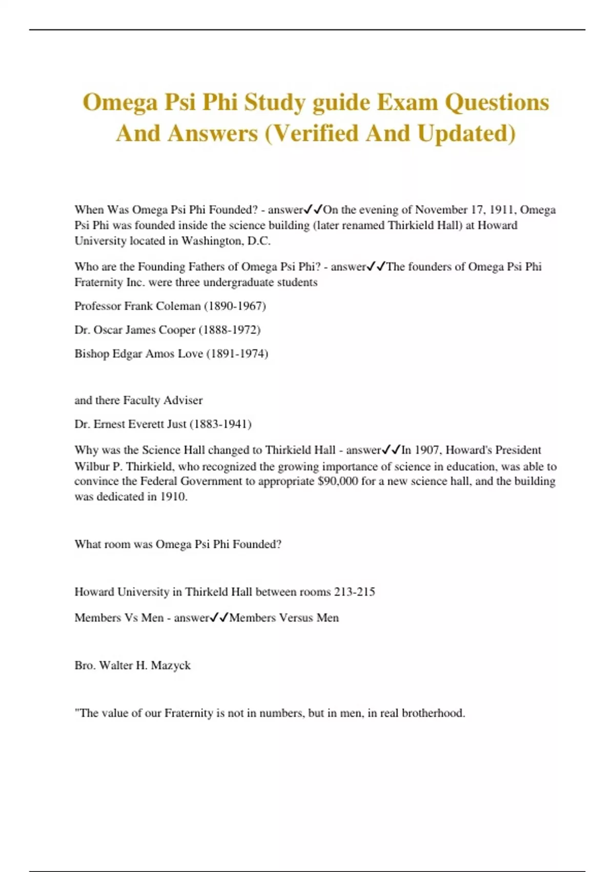 Omega Psi Phi Study guide Exam Questions And Answers (Verified And Updated) When Was Omega Psi Phi Founded? - answerOn the evening of November 17, 1911, Omega Psi Phi was founded inside the science building (later renamed Thirkield Hall) at Howard University located in Washington, D.C. Who are the Founding Fathers of Omega Psi Phi? - answerThe founders of Omega Psi Phi Fraternity Inc. were three undergraduate students Professor Frank Coleman () Dr. Oscar James Cooper () Bishop Edgar Amos Love () and there Faculty Adviser Dr. Ernest Everett Just () Why was the Science Hall changed to Thirkield Hall - answerIn 1907, Howard's President Wilbur P. Thirkield, who recognized the growing importance of science in education, was able to convince the Federal Government to appropriate $90,000 for a new science hall, and the building was dedicated in 1910. What room was Omega Psi Phi Founded? Howard University in Thirkeld Hall between rooms 213-215 Members Vs Men - answerMembers Versus Men Bro. Walter H. Mazyck "The value of our Fraternity is not in numbers, but in men, in real brotherhood. Eight men thoroughly immersed in the true Omega spirit are far greater assets than eighty with lukewarm enthusiasm." TO THY DUTY THAT IS BEST, LEAVE UNTO THE LORD THE REST What is the Omega Psi Phi motto" - answerFriendship is essential to the soul What are the Cardinal Principals of Omega Psi Phi? - answerManhood Scholarship Perserverance Uplift When was Omega Psi Phi Incorporated? - answerOmega Psi Phi was incorporated under the laws of the District of Columbia on October 28, 1914 at 1:11 PM When was Alpha Chapter Formed? - answerAlpha chapter was organized with fourteen charter members on December 15, 1911. Brothers Edgar A. Love, Oscar J. Cooper and Frank Coleman were elected the chapter first Basileus, Keeper of Records, and Keeper of Seals, respectively. Who was the First Grand Basileus of Omega Psi Phi? - answerBishop Edgar Amos Love - November 23, 1911 Dr. Oscar James Cooper as Grand Keeper of Records (Grand Keeper of Records and Seals or Grand KRS) Professor Frank Coleman as Grand Keeper of Seals (Grand Keeper of Finance or Grand KF). Recite "Invictus" - answerInvictus By William Ernest Henley Out of the night that covers me, Black as the pit from pole to pole, I thank whatever gods may be For my unconquerable soul. In the fell clutch of circumstance I have not winced nor cried aloud. Under the bludgeonings of chance My head is bloody, but unbowed. Beyond this place of wrath and tears Looms but the Horror of the shade, And yet the menace of the years Finds, and shall find, me unafraid. It matters not how strait the gate, How charged with punishments the scroll, I am the master of my fate: I am the captain of my soul. First Honorary Member of Omega Psi Phi - answerDr. Ernest Everett Just () Chi Omega Chapter History - answerTHE EARLY BEGINNING The Chi Omega Chapter of Omega Psi Phi Fraternity, Inc. was chartered December 15, 1924, in Thomasville, Ga. The Chapter experienced growth and stability as the roaring 20's ended. The 1930's were a time of despair for a large number of Americans due to the depression. Chi Omega traveled the troubled waters virtually unscathed and continued to experience growth. In 1932, Chi Omega relocated to Tallahassee, Florida. During the same year, Chi Omega was instrumental in establishing the Upsilon Psi Chapter on the campus of Florida A&M University. As the 1930's ended, Chi Omega was looking forward to the 1940's with zest and vigor. THE FORTIES As the clouds of World War II drew closer, Chi Omega braced itself for the inevitable challenge. Members of Chi Omega served