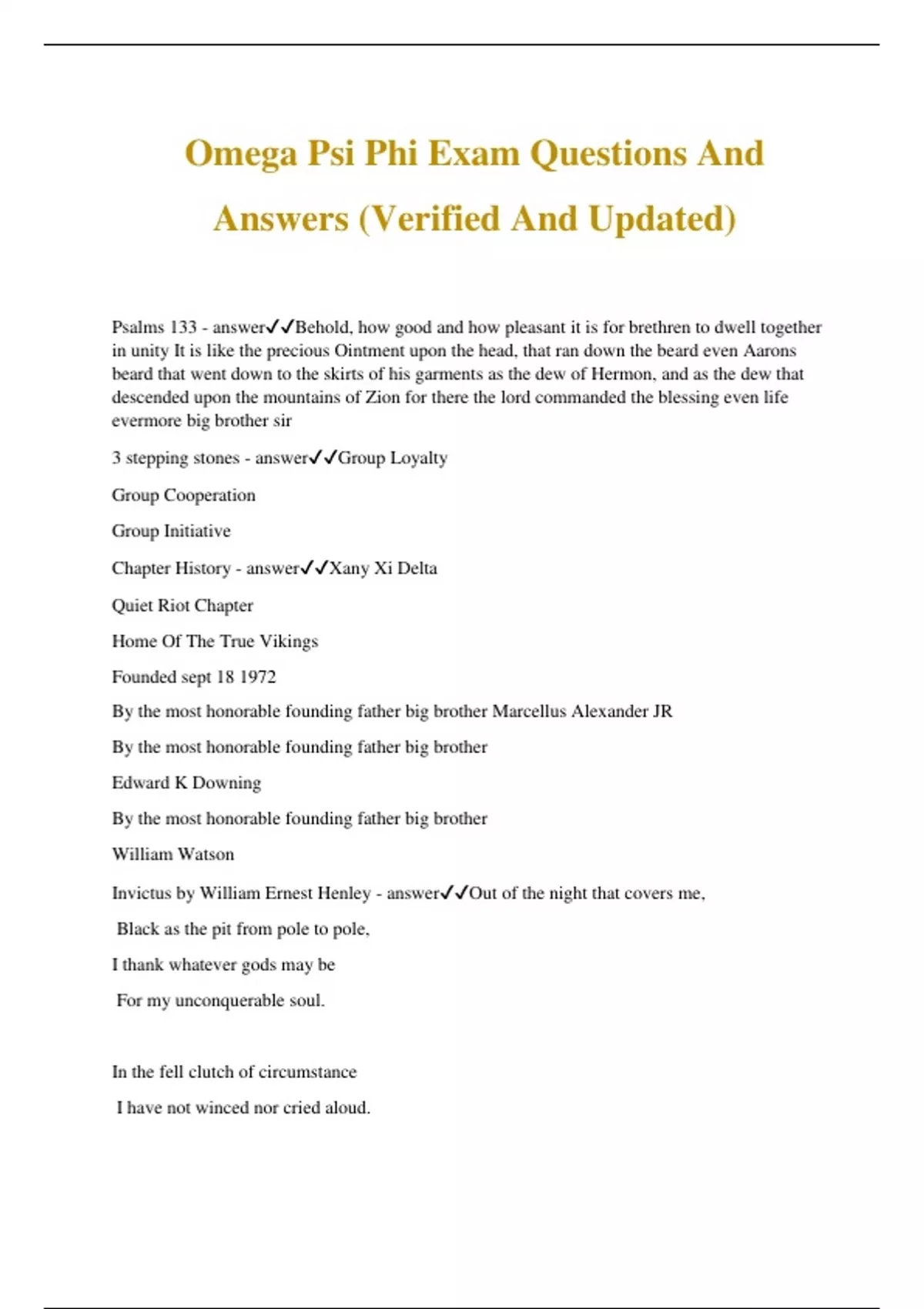 Omega Psi Phi Exam Questions And Answers (Verified And Updated) Psalms 133 - answerBehold, how good and how pleasant it is for brethren to dwell together in unity It is like the precious Ointment upon the head, that ran down the beard even Aarons beard that went down to the skirts of his garments as the dew of Hermon, and as the dew that descended upon the mountains of Zion for there the lord commanded the blessing even life evermore big brother sir 3 stepping stones - answerGroup Loyalty Group Cooperation Group Initiative Chapter History - answerXany Xi Delta Quiet Riot Chapter Home Of The True Vikings Founded sept 18 1972 By the most honorable founding father big brother Marcellus Alexander JR By the most honorable founding father big brother Edward K Downing By the most honorable founding father big brother William Watson Invictus by William Ernest Henley - answerOut of the night that covers me, Black as the pit from pole to pole, I thank whatever gods may be For my unconquerable soul. In the fell clutch of circumstance I have not winced nor cried aloud. Under the bludgeonings of chance My head is bloody, but unbow
