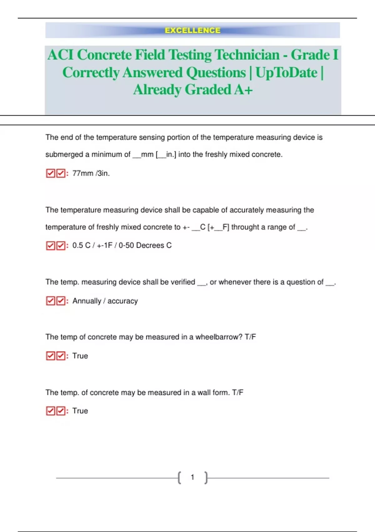 ACI Concrete Field Testing Technician - Grade I Correctly Answered Questions| UpToDate | Already Graded A+