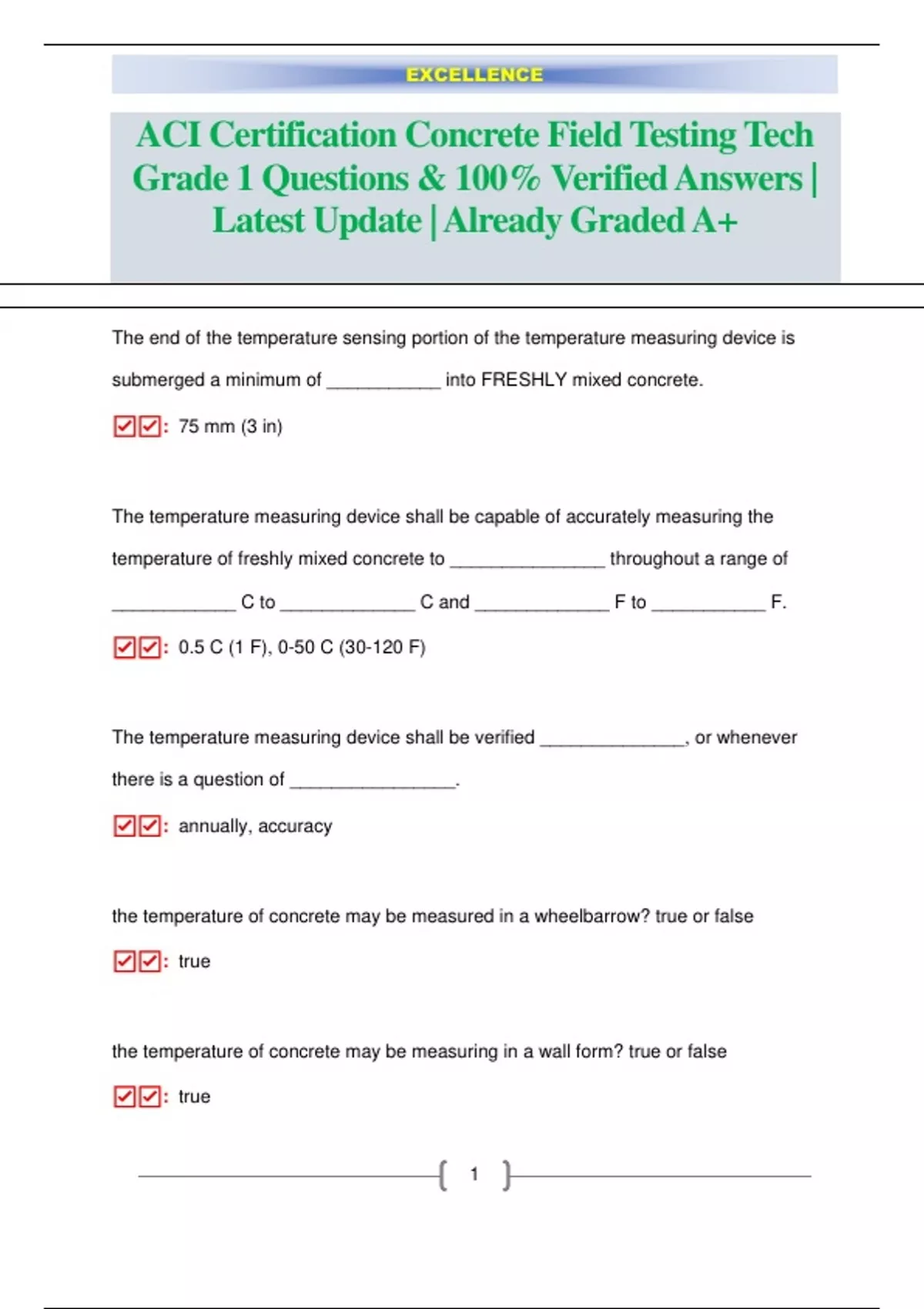 ACI Certification Concrete Field Testing Tech Grade 1 Questions & 100% Verified Answers | Latest Update | Already Graded A+