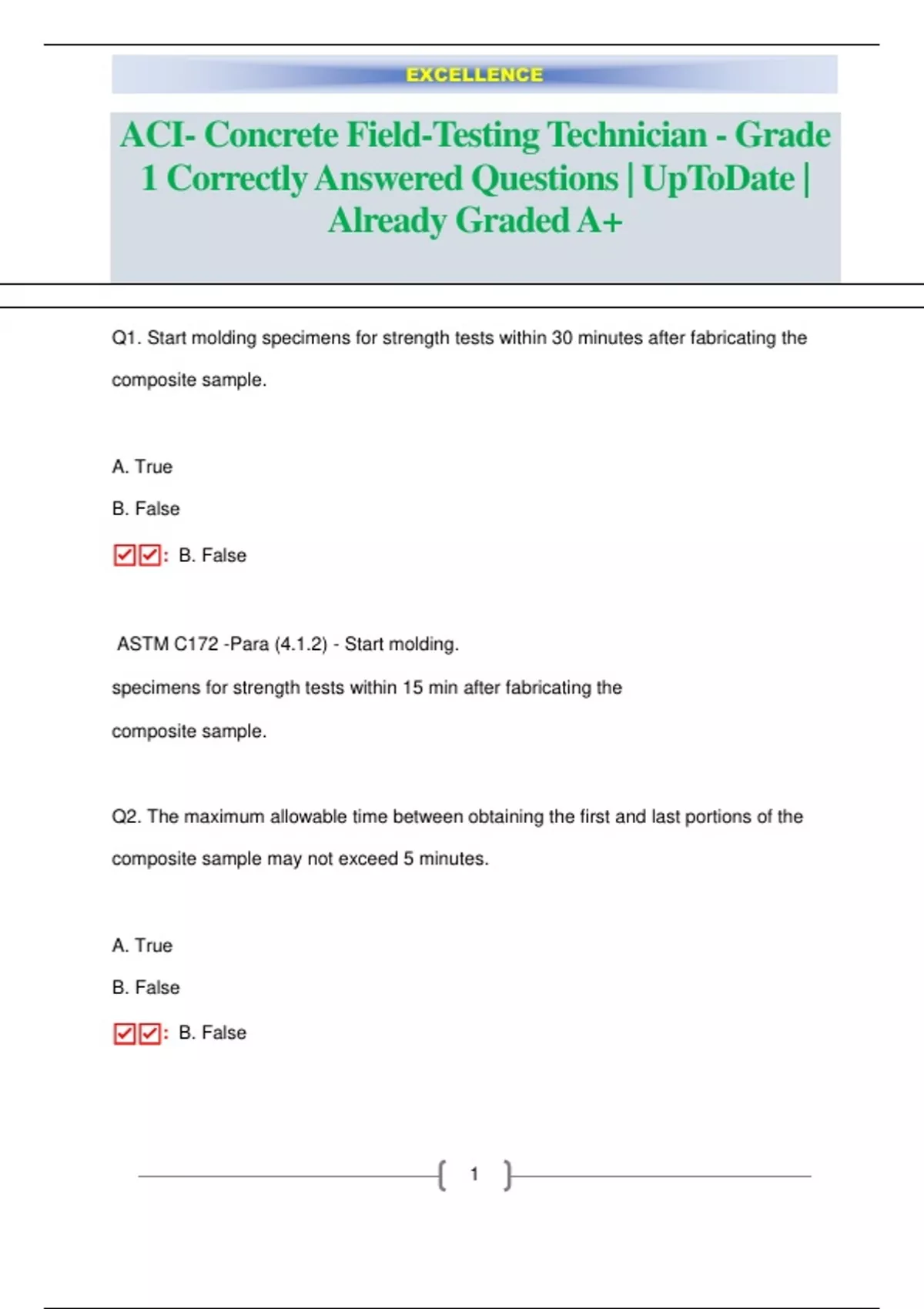 Q1. Start molding specimens for strength tests within 30 minutes after fabricating the composite sample. A. True B. False ☑: B. False ASTM C172 -Para (4.1.2) - Start molding. specimens for strength tests within 15 min after fabricating the composite sample. Q2. The maximum allowable time between obtaining the first and last portions of the composite sample may not exceed 5 minutes. A. True B. False ☑: B. False EXCELLENCE 2 ASTM C172 - Para (4.1)- The elapsed time shall not exceed 15 min. between obtaining the first and final portions of the composite sample. Q3. The composite concrete sample must be protected from sun, wind, contamination and rapid evaporation. A. True B. False ☑: A. True ASTM C172 - Para (4.1.2) Q4. If the concrete contains aggregates larger than those that are appropriate for a size of mold or equipment used, the sample should be wet sieved before making the test. A. True B. False ☑: A. True ASTM C172- Para (6.1) Q5. The composite sample should not be remixed before beginning any tests. EXCELLENCE 3 A. True B. False ☑: B. False ASTM C172-Para (4.1.1) -The sample shall be combined and remixed with a shovel the minimum amount necessary to ensure uniformity and compliance with the maximum time limits Q6. Sampling should normally be performed, as the concrete is discharged from the mixer. A. True B. False ☑: B. False ASTM C172-Para (5). NOTE 2—Sampling should normally be performed as the concrete is delivered from the mixer. To the conveying vehicle used to transport the concrete to the forms; however, specifications may require other points of sampling, such as the discharge of a concrete pump