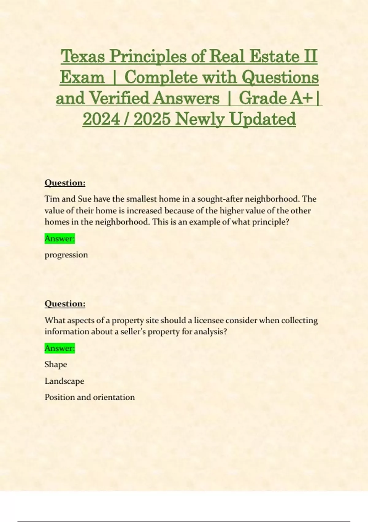 Texas Principles of Real Estate II Exam | Complete with Questions and Verified Answers | Grade A+ | 2024 / 2025 Newly Updated Q: Tim and Sue have the smallest home in a sought-after neighborhood. The value of their home is increased because of the higher value of the other homes in the neighborhood. This is an example of what principle? Answer: progression Q: What aspects of a property site should a licensee consider when collecting information about a seller's property for analysis? Answer: Shape Landscape Position and orientation Q: What is an example of a pitfall of overpricing? Answer: A home failing to sell and becoming an expired listing Q: What are the most reliable comparables to collect for a CMA? Answer: Sold homes that are most similar to the seller's property Q: A licensee has a listing with very close matching pending sale compara- bles. Using the comparables what should a licensee do to see if they have a good price for the listing? Answer: Contact the listing agent on the pending sale for price and sale information Q: When an appraiser is looking for comparables that have recently sold, they should look at similar properties that have sold within the last how many months? Answer: Three (3) to six (6) months Q: When doing a CMA, what is the minimum number of sold properties that should be included? Answer: three Q: Why should a licensee keep in mind that the information on pending sales is not as reliable as on sold homes? Answer: The sale price could even be lower or higher than the listing price. Q: Where can a licensee find most of the information they need to do a good analysis? Answer: From the multiple listing service (MLS) Q: For recently sold properties, the licensee should also be concerned with what? Answer: Date of the sale Financing TermsSale conditions Q: If a licensee has prepared a CMA, they make a comparison based on loca- tion, physical characteristics sale date and financing terms. The licensee will use the differences in these factors to make small adjustments to what? Answer: Sale price or the listing price. Q: When completing the CMA a licensee has a comparable that has a feature the seller's property does NOT have—for example, an extra bedroom—what adjustment must be made on the comparable? Answer: If a comparable has a feature that the seller's property does not have, subtract the value of that feature from the price of the comparable. Q: There are several factors that determine the value of a home at any given point in time, including Answer: Location Property condition Improvements Supply and demand Financing terms Q: Appraisal. Answer: An opinion or estimate of value performed by a licensed appraiser. Q: Comparative Market Analysis. Answer: Process a listing agent performs similar to an appraisal to give the seller an idea of the sales prices of similar homes in the area. Q: Principle of substitution. Answer: A buyer won't pay more for a property than they would pay for a property that is similar in characteristics and amenities. Q: Frontage Answer: The measurement of the length along the front boundary of a property either along a street or along a lake, river, or body of water. Q: Pending sales. Answer: Homes whose offers have been accepted by the sellers, but the sales haven't closed and the titles have not transferred. Q: Expired listings. Answer: Homes comparable to the seller's home that were listed but ultimately did not sell. Q: Cash equivalent sale Answer: When a buyer uses a conventional loan to purchase a property.