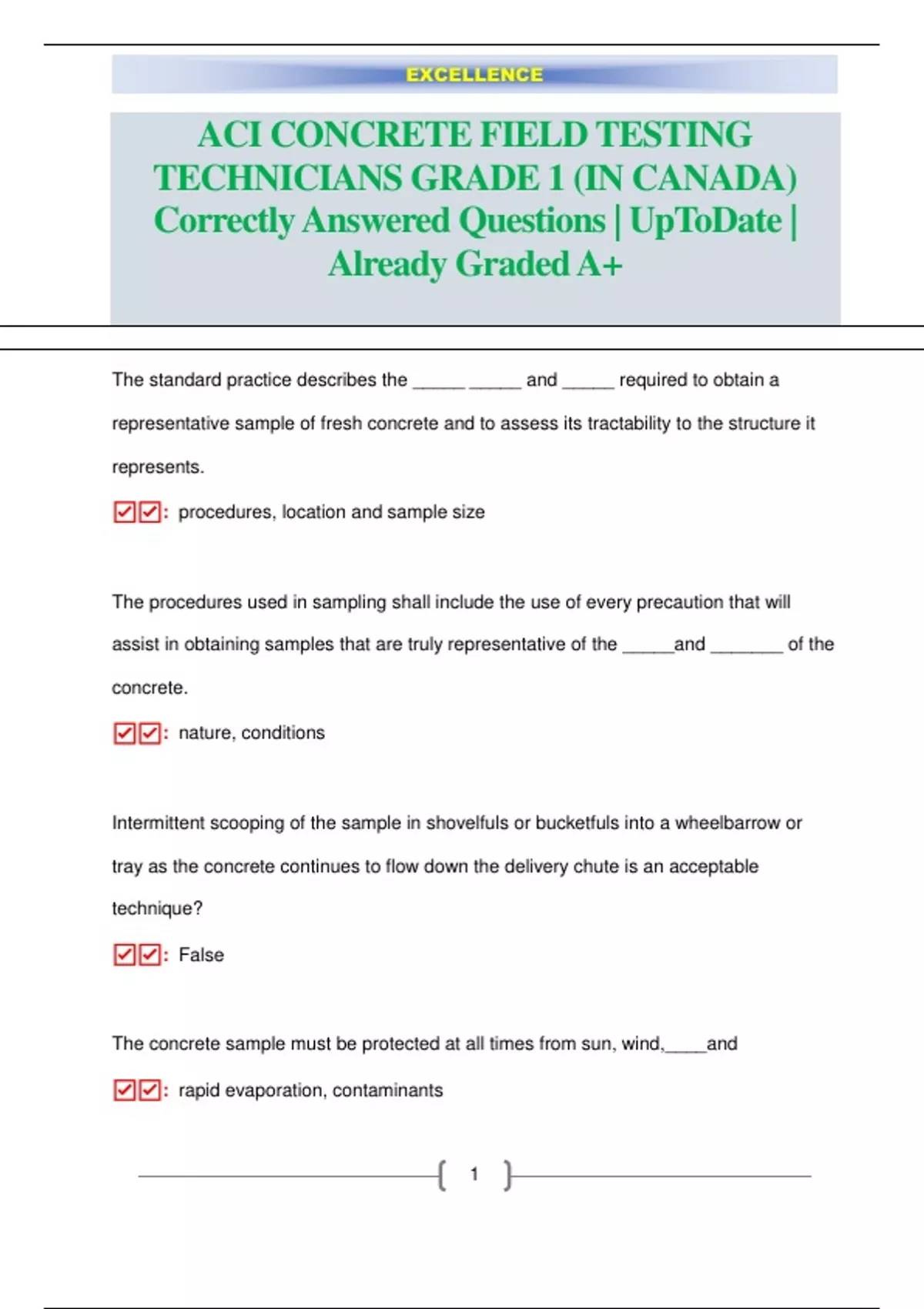 ACI CONCRETE FIELD TESTING TECHNICIANS GRADE 1 (IN CANADA) Correctly Answered Questions| UpToDate | Already Graded A+