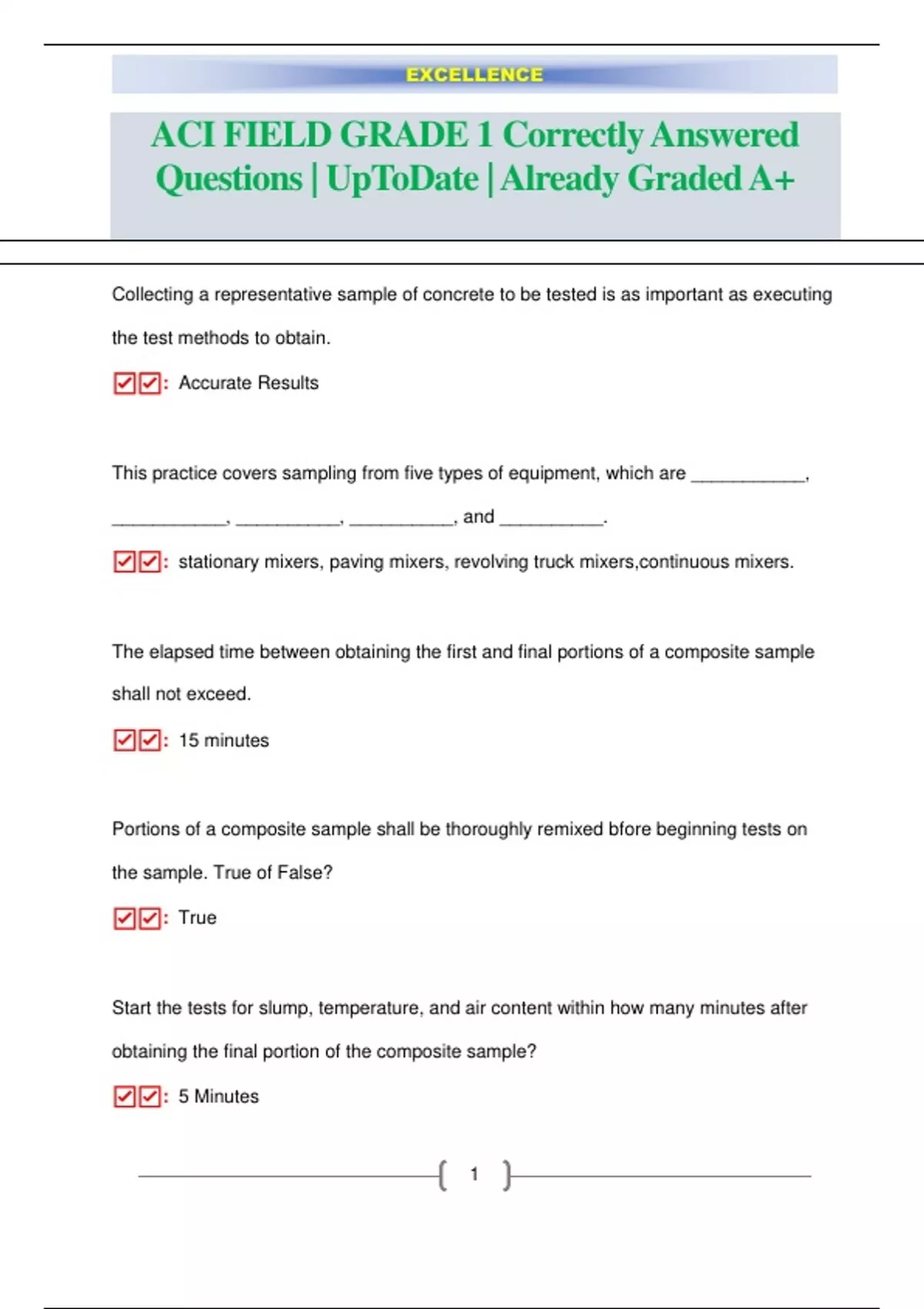 Collecting a representative sample of concrete to be tested is as important as executing the test methods to obtain. ☑: Accurate Results This practice covers sampling from five types of equipment, which are ___________, ___________, __________, __________, and __________. ☑: stationary mixers, paving mixers, revolving truck mixers,continuous mixers. The elapsed time between obtaining the first and final portions of a composite sample shall not exceed. ☑: 15 minutes Portions of a composite sample shall be thoroughly remixed bfore beginning tests on the sample. True of False? ☑: True Start the tests for slump, temperature, and air content within how many minutes after obtaining the final portion of the composite sample? ☑: 5 Minutes EXCELLENCE 2 Start molding specimens for strength tests within how many minutes after fabricating the composite sample? ☑: 15 Minutes The concrete sample must be protected from contamination and _____. ☑: Rapid Evaporation The minimum size sample for making strength test specimens is. ☑: one cubic foot When sampling from a stationary mixer, the batch must be sampled at _____ or more regularly spaced intervals during discharge of the middle portion of the batch ☑: 2 when sampling from a paving mixer, obtain samples from at least _______ different portions of the pile and combine them into one composite sample for test purposes. ☑: 5 When sampling from a revolving drum truck mixer, concrete must be sampled at a minimum of _____ regularly spaced intervals during discharge of the middle portion of this batch. ☑: 2 EXCELLENCE 3 Concrete samples from a truck mixer must be obtained before any water or admixtures are added to the mixer at the job site. True or False? ☑: False When the concrete contains aggregate larger than allowed for the slump test, the large aggregate must be _____. ☑: wet seived