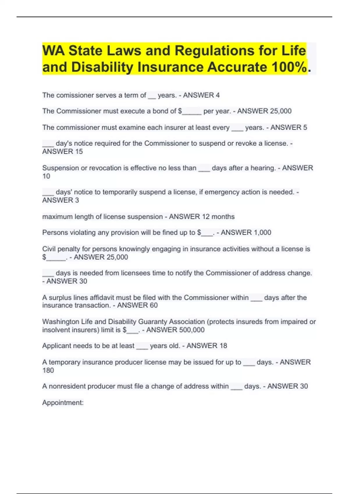 WA State Laws and Regulations for Life and Disability Insurance Accurate 100%.