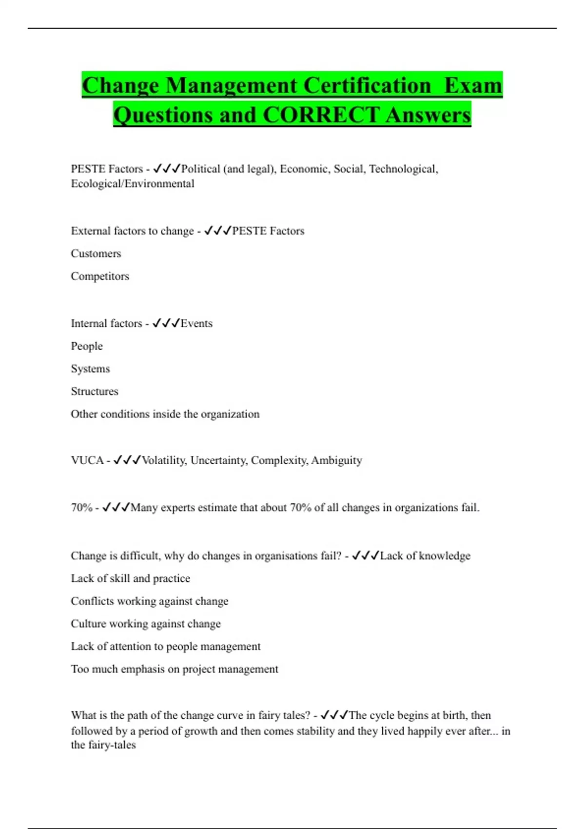 PESTE Factors - Political (and legal), Economic, Social, Technological, Ecological/Environmental External factors to change - PESTE Factors Customers Competitors Internal factors - Events People Systems Structures Other conditions inside the organization VUCA - Volatility, Uncertainty, Complexity, Ambiguity