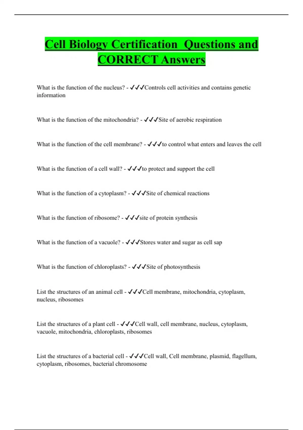 Cell Biology Certification Questions and CORRECT Answers