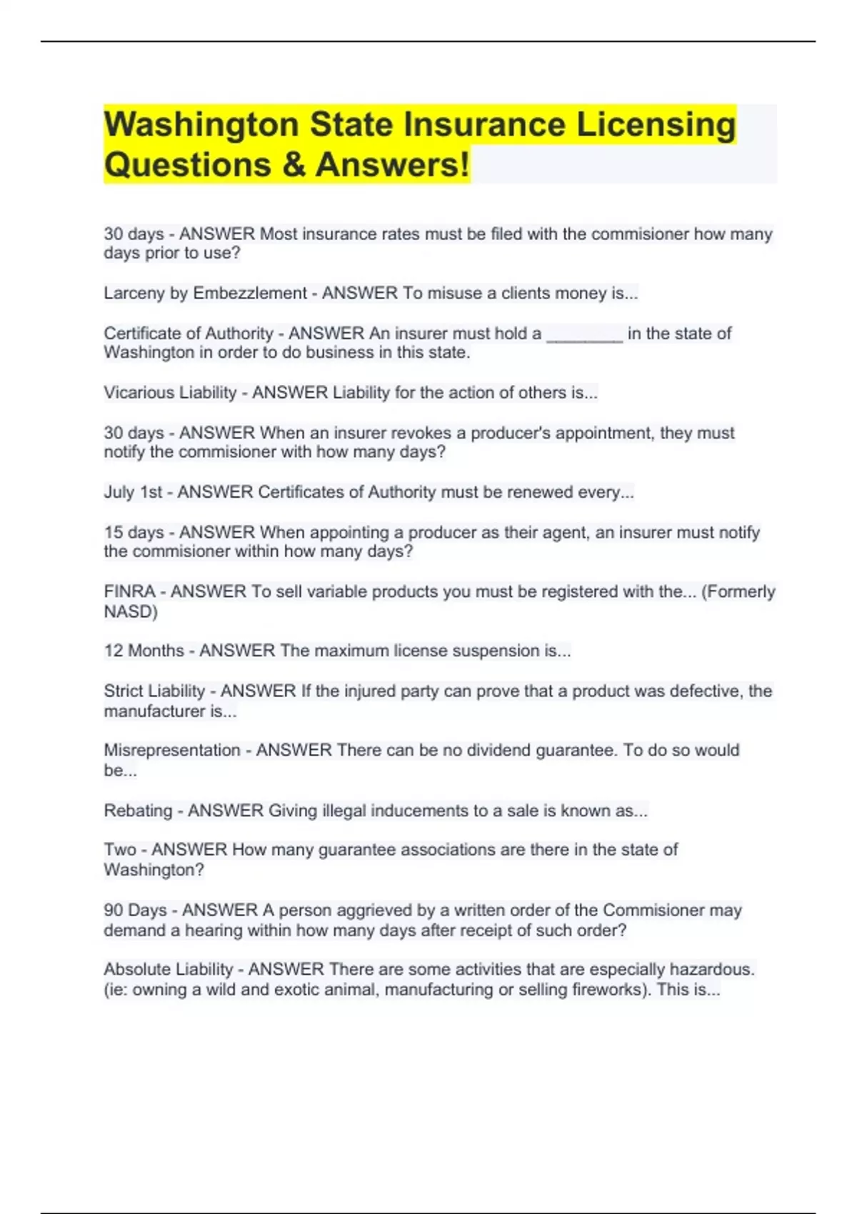 30 days - ANSWER Most insurance rates must be filed with the commisioner how many days prior to use? Larceny by Embezzlement - ANSWER To misuse a clients money is... Certificate of Authority - ANSWER An insurer must hold a ________ in the state of Washington in order to do business in this state. Vicarious Liability - ANSWER Liability for the action of others is... 30 days - ANSWER When an insurer revokes a producer's appointment, they must notify the commisioner with how many days? July 1st - ANSWER Certificates of Authority must be renewed every... 15 days - ANSWER When appointing a producer as their agent, an insurer must notify the commisioner within how many days? FINRA - ANSWER To sell variable products you must be registered with the... (Formerly NASD) 12 Months - ANSWER The maximum license suspension is... Strict Liability - ANSWER If the injured party can prove that a product was defective, the manufacturer is... Misrepresentation - ANSWER There can be no dividend guarantee. To do so would be... Rebating - ANSWER Giving illegal inducements to a sale is known as... Two - ANSWER How many guarantee associations are there in the state of Washington? 90 Days - ANSWER A person aggrieved by a written order of the Commisioner may demand a hearing within how many days after receipt of such order? Absolute Liability - ANSWER There are some activities that are especially hazardous. (ie: owning a wild and exotic animal, manufacturing or selling fireworks). This is... 30