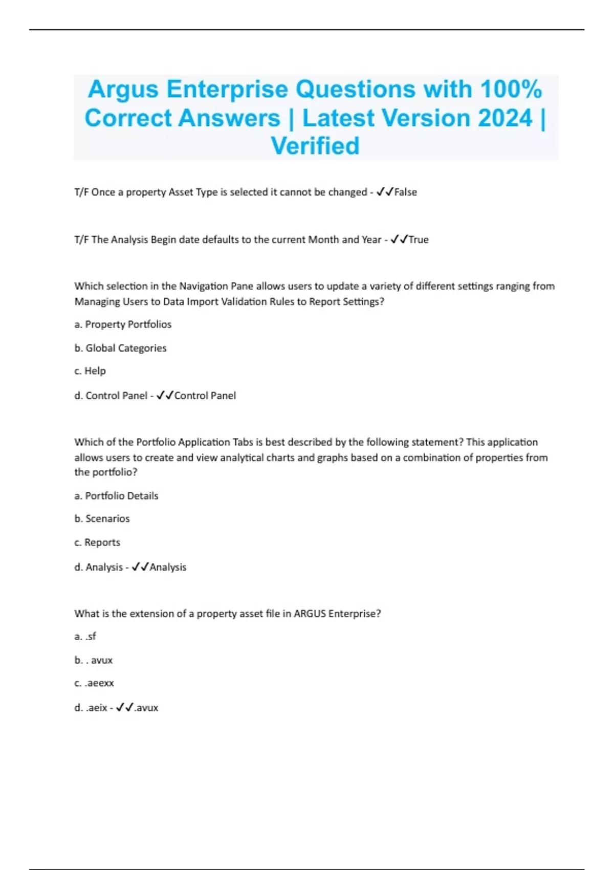 Argus Enterprise Questions with 100% Correct Answers | Latest Version 2024 | Verified T/F Once a property Asset Type is selected it cannot be changed - False T/F The Analysis Begin date defaults to the current Month and Year - True Which selection in the Navigation Pane allows users to update a variety of different settings ranging from Managing Users to Data Import Validation Rules to Report Settings? a. Property Portfolios b. Global Categories c. Help d. Control Panel - Control Panel Which of the Portfolio Application Tabs is best described by the following statement? This application allows users to create and view analytical charts and graphs based on a combination of properties from the portfolio? a. Portfolio Details b. Scenarios c. Reports d. Analysis - Analysis What is the extension of a property asset file in ARGUS Enterprise? a. .sf b. . avux c. .aeexx d. .aeix - .avux ______ saves the updates to the property asset model to the database. If a calculation has been performed, it also saves the latest calculation results. a. Refresh b. Save Property to File c. Check In/Out Property d. Save Property - Save Property What should be selected as the 'How Input' method for the revenue or expense to be based on a percentage of other cash flow items in the property? a. Amount 1 b. Sub-lines c. % of Other d. Currency Amount/Vacant Area - % of Other Common Area Maintenance (CAM) is $100,00 and is 50.0% fixed. Occupancy is 75.0% a. What dollar amount should be entered in the Amount1 field? b. What will be the actual expense on the Cash Flow for CAM? - a. 100,000 b. ($100,000 * 50% fixed) + ($100,000 * 50% variable * 75%) = $50,000 + $37,500 = $87,500 Insurance is $80,000 and is 100% fixed. Occupancy is 85% a. What dollar amount should be entered in the Amount1 field? b. What will be the actual expense on the Cash Flow for Insurance? - a. $80,000 b. ($80,000 * 100% fixed) + ($80,000 * 0% variable * 85% occupancy) = $80,000 + $0 = $80,000 To replicate a value in a specific month of each year during the project for a specific expense, you must click which button in the Amount1 Varies window? a. Copy Across & Down b. Copy to End c. Copy Column to End d. Column - Copy Column to End Review End of Ch. 3 Screenshot questions - When calculating a Market Leasing profile with the Upon Expiration set to Renewal, Enterprise ______. a. assumes a 0% renewal. b. takes a weighted average. c. assumes the space goes dark. d. assumes a 100% renewal. - assumes a 100% renewal T/F The Upon Expiration field within the Market Leasing profile allows us to select any overrides for past terms. - False T/F When you have a one-time increase, or an increase that happens at different increments or times, utilize the Fixed Steps Unit column. - False When entering an Available Date prior to the Start Date within the Rent Roll, ARGUS Enterprise will assume: a. The space is not available until the Start Date b. The space is available, but vacant until the Start Date c. The space is occupied until the Start Date