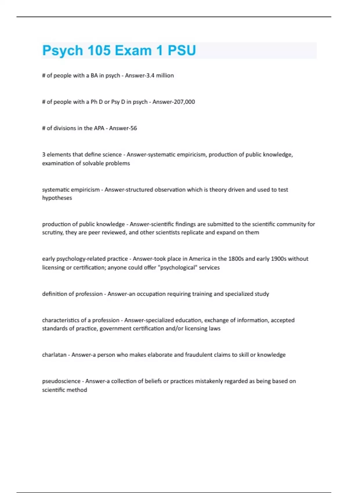 Psych 105 Exam 1 PSU Questions And Answers With Verified Study Solutions