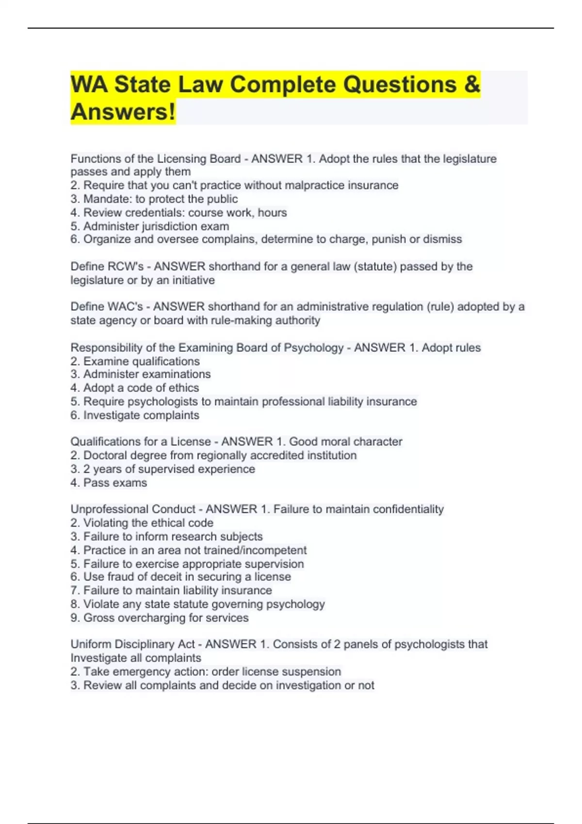 Functions of the Licensing Board - ANSWER 1. Adopt the rules that the legislature passes and apply them 2. Require that you can't practice without malpractice insurance 3. Mandate: to protect the public 4. Review credentials: course work, hours 5. Administer jurisdiction exam 6. Organize and oversee complains, determine to charge, punish or dismiss Define RCW's - ANSWER shorthand for a general law (statute) passed by the legislature or by an initiative Define WAC's - ANSWER shorthand for an administrative regulation (rule) adopted by a state agency or board with rule-making authority Responsibility of the Examining Board of Psychology - ANSWER 1. Adopt rules 2. Examine qualifications 3. Administer examinations 4. Adopt a code of ethics 5. Require psychologists to maintain professional liability insurance 6. Investigate complaints Qualifications for a License - ANSWER 1. Good moral character 2. Doctoral degree from regionally accredited institution 3. 2 years of supervised experience 4. Pass exams Unprofessional Conduct - ANSWER 1. Failure to maintain confidentiality 2. Violating the ethical code 3. Failure to inform research subjects 4. Practice in an area not trained/incompetent 5. Failure to exercise appropriate supervision 6. Use fraud of deceit in securing a license 7. Failure to maintain liability insurance 8. Violate any state statute governing psychology 9. Gross overcharging for services Uniform Disciplinary Act - ANSWER 1. Consists of 2 panels of psychologists that Investigate all complaints 2. Take emergency action: order license suspension 3. Review all complaints and decide on investigation or not 4. If found in violation: charging, adjudication