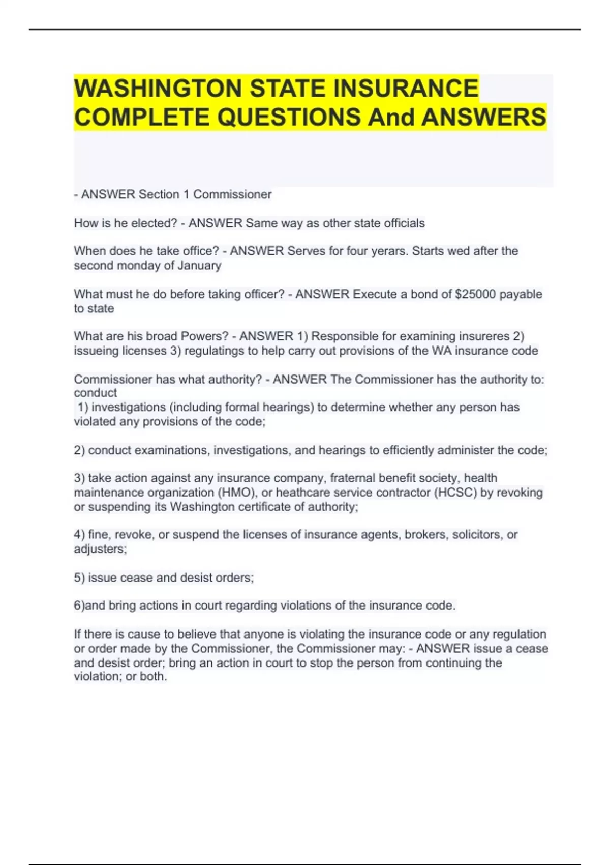 WASHINGTON STATE INSURANCE COMPLETE QUESTIONS And ANSWERS