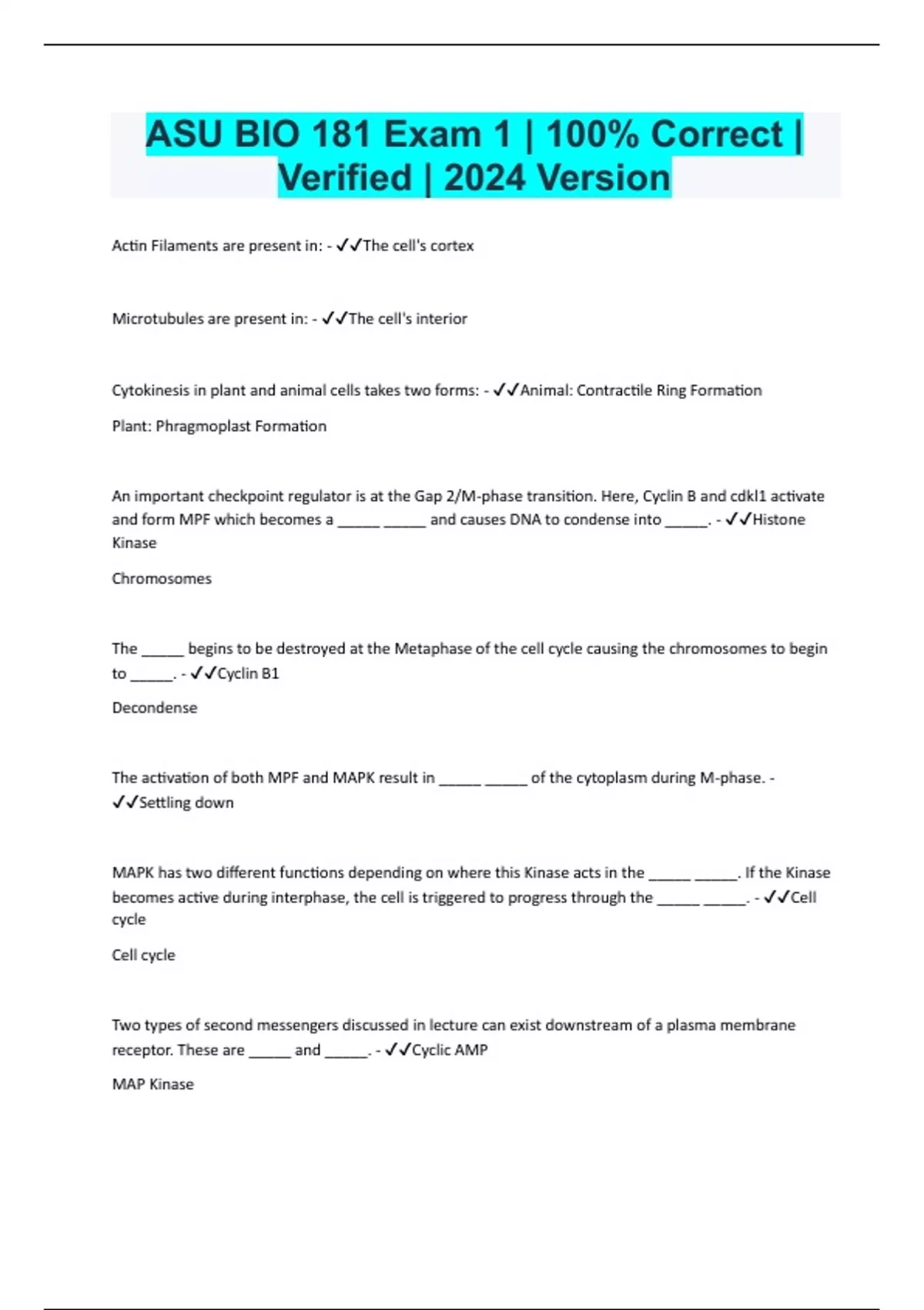 ASU BIO 181 Exam 1 | 100% Correct | Verified | 2024 Version Actin Filaments are present in: - The cell's cortex Microtubules are present in: - The cell's interior Cytokinesis in plant and animal cells takes two forms: - Animal: Contractile Ring Formation Plant: Phragmoplast Formation An important checkpoint regulator is at the Gap 2/M-phase transition. Here, Cyclin B and cdkl1 activate and form MPF which becomes a _____ _____ and causes DNA to condense into _____. - Histone Kinase Chromosomes The _____ begins to be destroyed at the Metaphase of the cell cycle causing the chromosomes to begin to _____. - Cyclin B1 Decondense The activation of both MPF and MAPK result in _____ _____ of the cytoplasm during M-phase. - Settling down MAPK has two different functions depending on where this Kinase acts in the _____ _____. If the Kinase becomes active during interphase, the cell is triggered to progress through the _____ _____. - Cell cycle Cell cycle Two types of second messengers discussed in lecture can exist downstream of a plasma membrane receptor. These are _____ and _____. - Cyclic AMP MAP Kinase There are two basic forms of cytoplasmic signaling (i.e signal transduction). One uses _____ and the other uses _____. - Protein Kinases Calcium Signal What is the difference between a single-pass transmembrane protein and a 7-pass transmembrane protein? - A single pass TMP is a singular protein that passes once through the bilayer. A 7-pass protein passes through the bilayer 7 times, creating a channel for ions to pass through. A single pass TMP cannot create an ion channel. Is a cancer cell anchorage independent and immortal, or is it anchorage dependent and mortal? Do they exhibit contact inhibition? - They are anchorage independent and immortal, and they do not exhibit contact inhibition, because they continue to grow despite their surroundings. If something is soluble in water, a hydration forms around it and it is termed: - Hydrophilic. What limits the paramecium from acquiring more complex functions? - The paramecium cannot fit any more biomachinery into its space. What limits an individual cell from becoming more complex? - Division of labor. T/F: In your own multicellular body, different cells have a division of labor between them: - True. T/F: A normal cell is anchorage-dependent for growth and mortal: - True. Comparing a single-celled Eukaryotic organism with a multi-cellular organism such as yourself, what is the major difference: - Division of labor. T/F: In your own multicellular body, cells with different functions have different DNA: - False. A single celled Eukaryotic organism: - Has a limited number of biomolecular machines Must find food, shelter, a mate, and reproduce Must escape from predators The paramecium discussed in class has contained an organelle called the contractile vacuole. This is the presumed precursor of the: - Kidney. T/F: A cell that is anchorage-dependent for growth will also exhibit contact inhibition: - True. In order to examine cells that are smaller than can be detected by the human eye, what needs to be used? - Technology. Compared to bacteria, which of the cell types are not responsible for finding food? - Lymphocyte Macrophage Fibroblast In cell biology, what can limit the progress of science? - Technology. T/F: The contractile vacuole of the paramecium is possibly