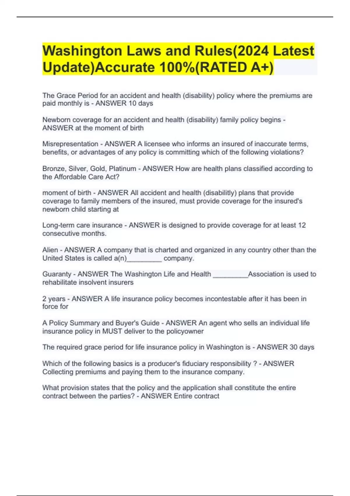 The Grace Period for an accident and health (disability) policy where the premiums are paid monthly is - ANSWER 10 days Newborn coverage for an accident and health (disability) family policy begins - ANSWER at the moment of birth Misrepresentation - ANSWER A licensee who informs an insured of inaccurate terms, benefits, or advantages of any policy is committing which of the following violations? Bronze, Silver, Gold, Platinum - ANSWER How are health plans classified according to the Affordable Care Act? moment of birth - ANSWER All accident and health (disabilitly) plans that provide coverage to family members of the insured, must provide coverage for the insured's newborn child starting at Long-term care insurance - ANSWER is designed to provide coverage for at least 12 consecutive months. Alien - ANSWER A company that is charted and organized in any country other than the United States is called a(n)_________ company. Guaranty - ANSWER The Washington Life and Health _________Association is used to rehabilitate insolvent insurers 2 years - ANSWER A life insurance policy becomes incontestable after it has been in force for A Policy Summary and Buyer's Guide - ANSWER An agent who sells an individual life insurance policy in MUST deliver to the policyowner The required grace period for life insurance policy in Washington is - ANSWER 30 days Which of the following basics is a producer's fiduciary responsibility ? - ANSWER Collecting premiums and paying them to the insurance company. What provision states that the policy and the application shall constitute the entire contract between the parties? - ANSWER Entire contract A