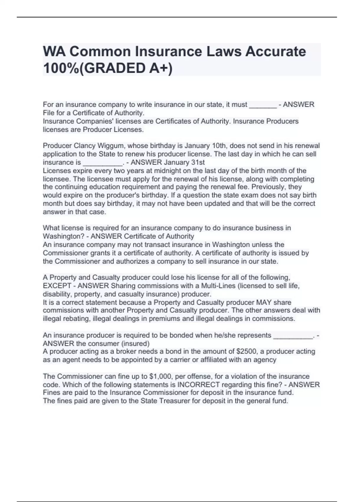 For an insurance company to write insurance in our state, it must _______ - ANSWER File for a Certificate of Authority. Insurance Companies' licenses are Certificates of Authority. Insurance Producers licenses are Producer Licenses. Producer Clancy Wiggum, whose birthday is January 10th, does not send in his renewal application to the State to renew his producer license. The last day in which he can sell insurance is __________. - ANSWER January 31st Licenses expire every two years at midnight on the last day of the birth month of the licensee. The licensee must apply for the renewal of his license, along with completing the continuing education requirement and paying the renewal fee. Previously, they would expire on the producer's birthday. If a question the state exam does not say birth month but does say birthday, it may not have been updated and that will be the correct answer in that case. What license is required for an insurance company to do insurance business in Washington? - ANSWER Certificate of Authority An insurance company may not transact insurance in Washington unless the Commissioner grants it a certificate of authority. A certificate of authority is issued by the Commissioner and authorizes a company to sell insurance in our state. A Property and Casualty producer could lose his license for all of the following, EXCEPT - ANSWER Sharing commissions with a Multi-Lines (licensed to sell life, disability, property, and casualty insurance) producer. It is a correct statement because a Property and Casualty producer MAY share commissions with another Property and Casualty producer. The other answers deal with illegal rebating, illegal dealings in premiums and illegal dealings in commissions. An insurance producer is required to be bonded when he/she represents __________. - ANSWER the consumer (insured) A producer acting as a broker needs a bond in the amount of $2500, a producer acting as an agent needs to be appointed by a carrier or affiliated with an agency The Commissioner can fine up to $1,000, per offense, for a violation of the insurance code. Which of the following statements is INCORRECT regarding this fine? - ANSWER Fines are paid to the Insurance Commissioner for deposit in the insurance fund. The fines paid are given to the State Treasurer for deposit in the general fund. Should a producer secure a second office location, the producer must - ANSWER get a duplicate license for the second location. A
