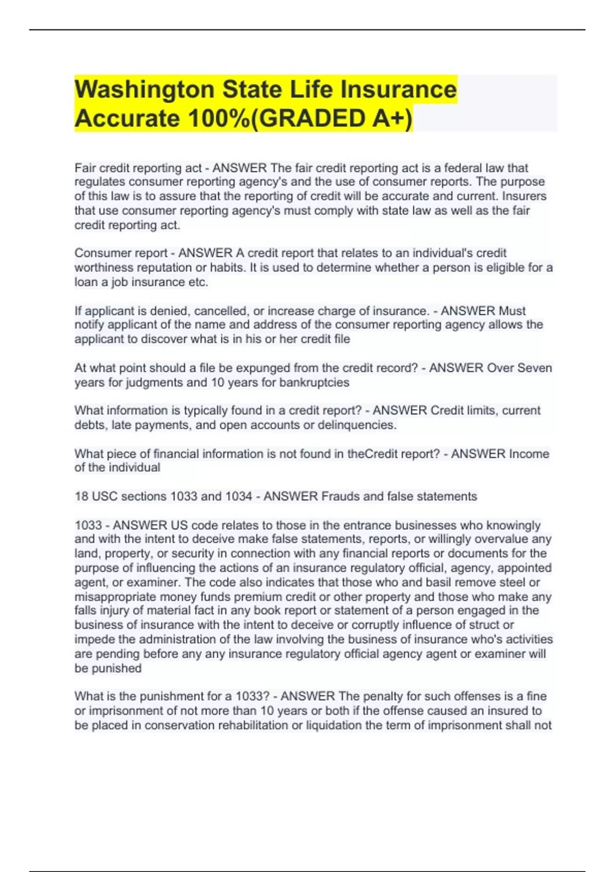 Washington State Life Insurance Accurate 100%(GRADED A+)