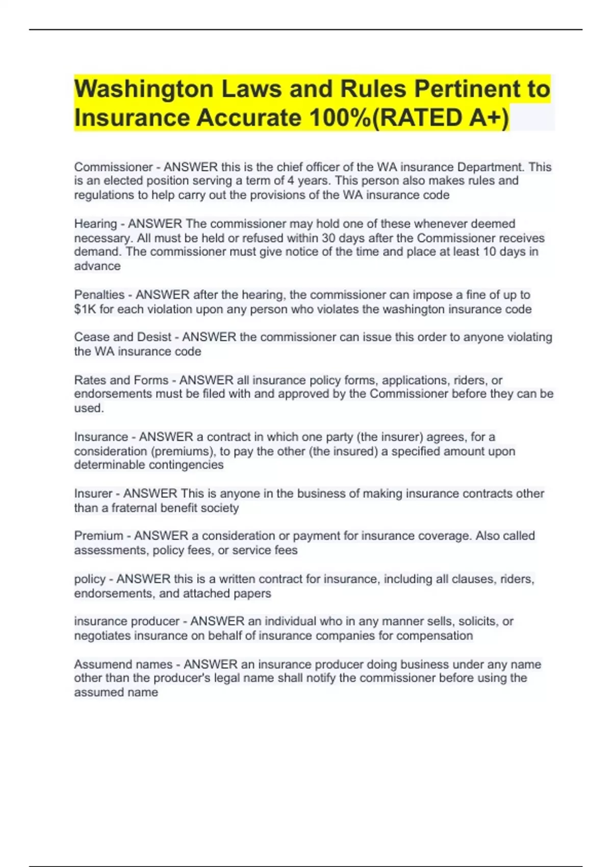Washington Laws and Rules Pertinent to Insurance Accurate 100%(RATED A+)