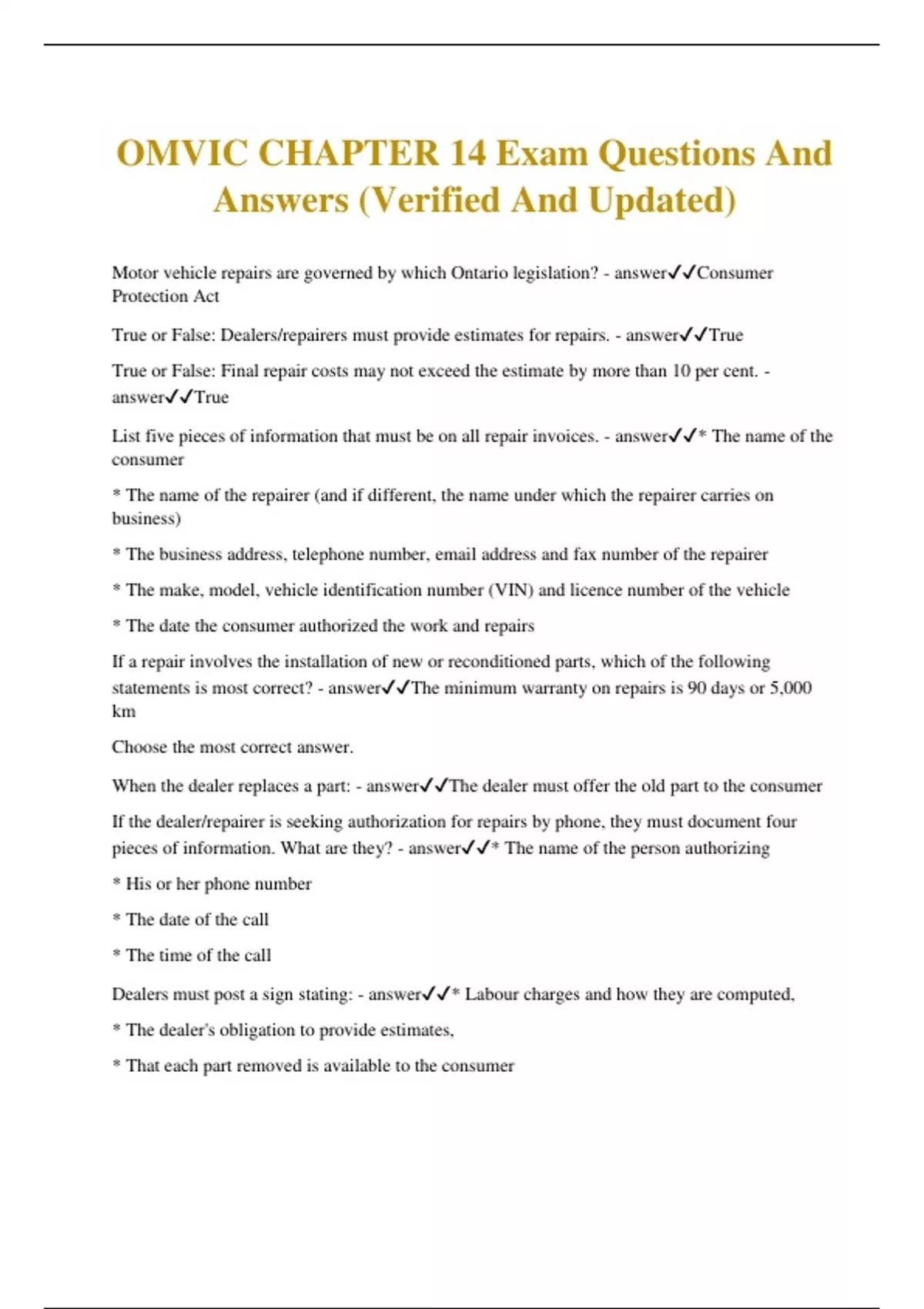OMVIC CHAPTER 14 Exam Questions And Answers (Verified And Updated) Motor vehicle repairs are governed by which Ontario legislation? - answerConsumer Protection Act True or False: Dealers/repairers must provide estimates for repairs. - answerTrue True or False: Final repair costs may not exceed the estimate by more than 10 per cent. - answerTrue List five pieces of information that must be on all repair invoices. - answer* The name of the consumer * The name of the repairer (and if different, the name under which the repairer carries on business)