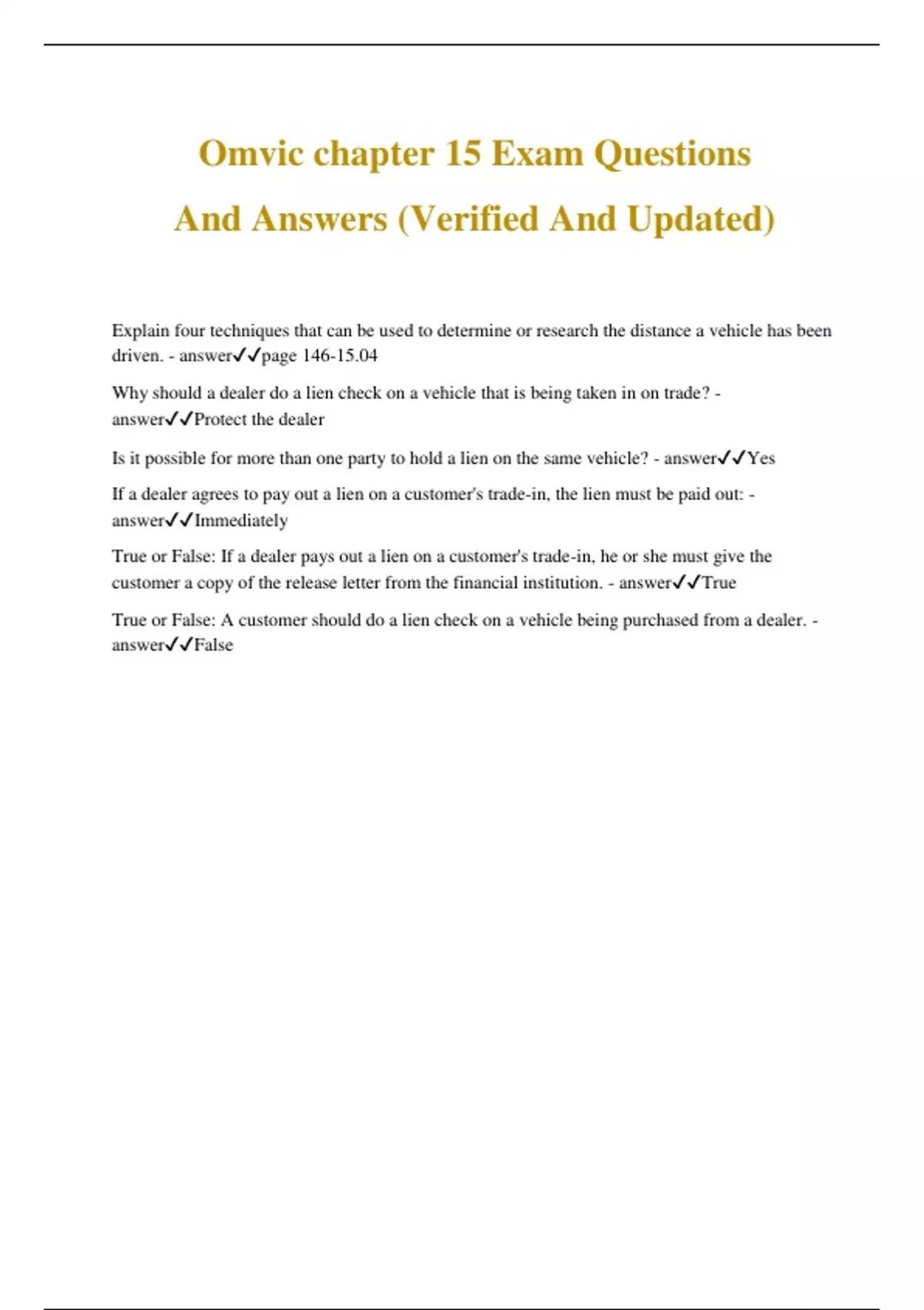 Omvic chapter 15 Exam Questions And Answers (Verified And Updated) Explain four techniques that can be used to determine or research the distance a vehicle has been driven. - answerpage 146-15.04 Why should a dealer do a lien check on a vehicle that is being taken in on trade? - answerProtect the dealer