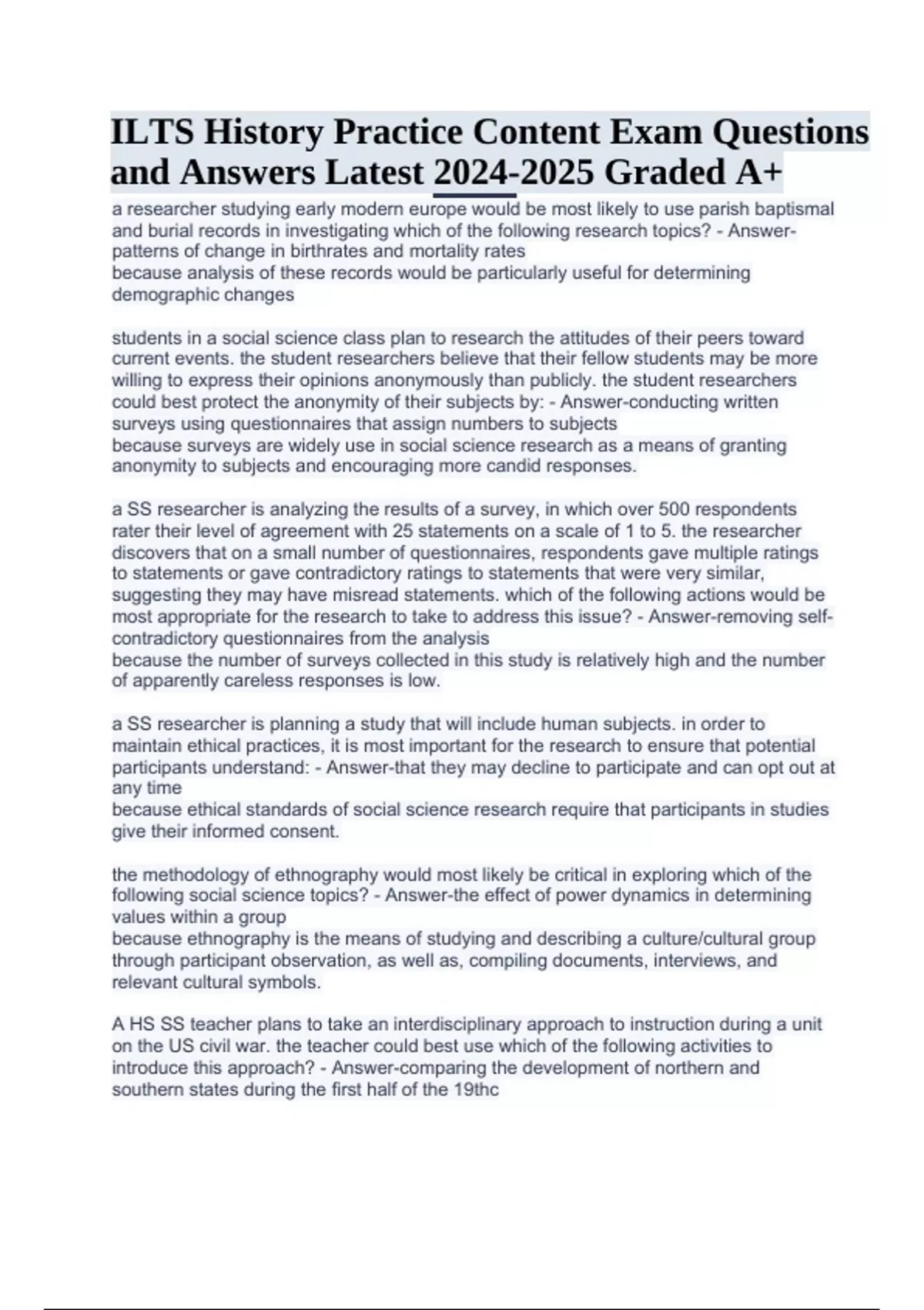 ILTS History Practice Exam Questions and Answers Latest Graded A+. a researcher studying early modern europe would be most likely to use parish baptismal and burial records in investigating which of the following research topics? - Answerpatterns of change in birthrates and mortality rates because analysis of these records would be particularly useful for determining demographic changes students in a social science class plan to research the attitudes of their peers toward current events. the student researchers believe that their fellow students may be more willing to express their opinions anonymously than publicly. the student researchers could best protect the anonymity of their subjects by: - Answer-conducting written surveys using questionnaires that assign numbers to subjects because surveys are widely use in social science research as a means of granting anonymity to subjects and encouraging more candid responses. a SS researcher is analyzing the results of a survey, in which over 500 respondents rater their level of agreement with 25 statements on a scale of 1 to 5. the researcher discovers that on a small number of questionnaires, respondents gave multiple ratings to statements or gave contradictory ratings to statements that were very similar, suggesting they may have misread statements. which of the following actions would be most appropriate for the research to take to address this issue? - Answer-removing selfcontradictory questionnaires from the analysis because the number of surveys collected in this study is relatively high and the number of apparently careless responses is low. a SS researcher is planning a study that will include human subjects. in order to maintain ethical practices, it is most important for the research to ensure that potential participants understand: - Answer-that they may decline to participate and can opt out at any time because ethical standards of social science research require that participants in studies give their informed consent. the methodology of ethnography would most likely be critical in exploring which of the following social science topics? - Answer-the effect of power dynamics in determining values within a group because ethnography is the means of studying and describing a culture/cultural group through participant observation, as well as, compiling documents, interviews, and relevant cultural symbols. A HS SS teacher plans to take an interdisciplinary approach to instruction during a unit on the US civil war. the teacher could best use which of the following activities to introduce this approach? - Answer-comparing the development of northern and southern states during the first half of the 19thc ILTS History Practice Content Exam Questions and Answers Latest Graded A+ because industry, mining, transportation, and other economic activities grew rapidly in the norther states, while the southern states retained a largely agrarian economy based on enslaved labor. Read the passage below: "... Sadly, policies protecting the rainforests have been undermined by powerful ranching and logging interests. In 2016 alone, deforestation rates increased 29%" Based on the evidence in the passage, the author's statement that efforts to protect the amazon rainforest were undermined by ranching and logging interests is best characterized by: - Answer-an assertion because no evidence about what cause the rates to climb after 2012 is provided, however, the author's claim that ranching and logging interests are to blame is best described as an assertion. Read the excerpt below from an 1892 speech by Elizabeth Cady Stanton: ... In the excerpt, Stanton primarily addresses which of the following questions? - AnswerWhat do women need in order to be fully sovereign individuals? because in this excerpt from her speech "The Solitude of Self," Stanton addresses the needs of women as sovereign individuals. she argues that women should have opportunities for education and growth, as well as their full freedom, so that each can take "personal responsibility of her own individual life." in addition to the sectional conflict over slavery, a marxist interpretation of the causes of the US Civil War would most likely emphasize which of the following factors? - Answerthe conflicting economic goals of industrial and agrarian capitalists because a marxist interpretation of the cause of the civil war would likely also examine the north and south's particular forms of economic exploitation (free vs. slave labor) as an intractable difference that contributed to the outbreak of the war A HS SS teacher wants students to understand the tentative nature of historical interpretation. which of the following pairs of sources would be most helpful to the teacher in accomplishing this goal? - Answer-an analysis of the civil war written during Reconstruction and a history of the Civil War written 50 years later because historical interpretation changes over time A historian analyzing the relationship between the patriarchal social orders and gender roles int he history of China from the Han to the Qing Dynasty would most likely utilize which of the following historical concepts? - Answer-patterns of continuity and change because historical analysis that addresses a specific theme that spans a long period of time and crosses traditional chronological divisions addresses patterns of continuity and change over time A HS SS teacher sets assessing the relative strengths and limitations of sources as a learning goal for students, including sources reflecting different historical perspectives. the teacher would find which of the following pars of documents most useful for facilitating this goal? - Answer-a 1990 interview with a WWII veteran and a war correspondent's reporting from 1942 because in the social sciences, primary source have both strengths (first-hand accounts) and limitations (narrowness of perspective). by comparing war reporting from during WWII to a recollection of what ha