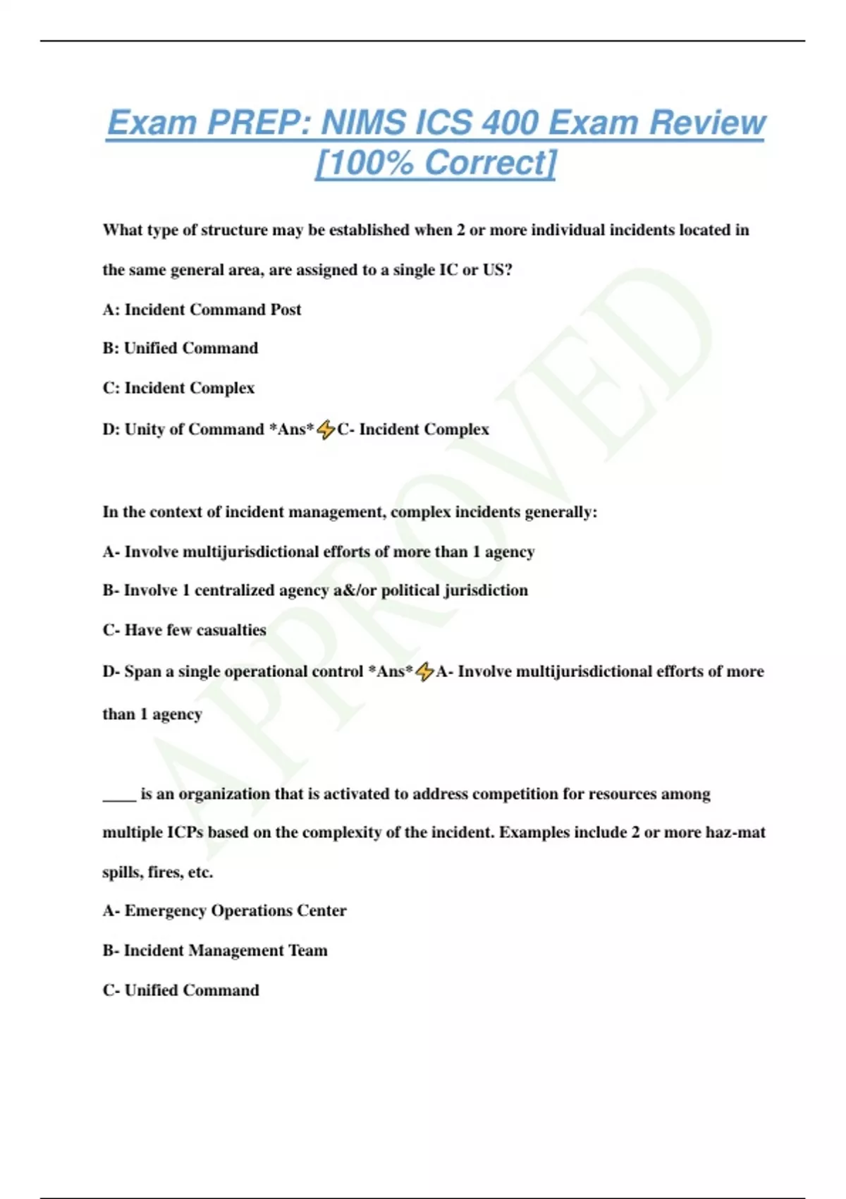 Exam PREP: NIMS ICS 400 Exam Review [100% Correct] What type of structure may be established when 2 or more individual incidents located in the same general area, are assigned to a single IC or US? A: Incident Command Post B: Unified Command C: Incident Complex D: Unity of Command *Ans* C- Incident Complex In the context of incident management, complex incidents generally: A- Involve multijurisdictional efforts of more than 1 agency B- Involve 1 centralized agency a&/or political jurisdiction C- Have few casualties D- Span a single operational control *Ans* A- Involve multijurisdictional efforts of more than 1 agency ____ is an organization that is activated to address competition for resources among multiple ICPs based on the complexity of the incident. Examples include 2 or more haz-mat spills, fires, etc. A- Emergency Operations Center B- Incident Management Team C- Unified Command D- Area Command *Ans* D- Area Command How does the use of Area Command facilitate the job of the IC and agency officials? a) Much of the Coordination between incidentss that is typically performed by the IC is accomplished at the Area Command level b) Area Command determines the incident tactics, objectives, and strategies. c) Establishing Area Command eliminates the need for a written delegation of authority. d) Area Command replaces the incident-level ICS organizations and streamlines Incident Commander functions and tasks. *Ans* a) Much of the Coordination between incidentss that is typically performed by the IC is accomplished at the Area Command level What is an advantage of activating an Area Command? A- The role of the Incident Commander is shared by 2 or more persons B-Allows different agencies to work togethe