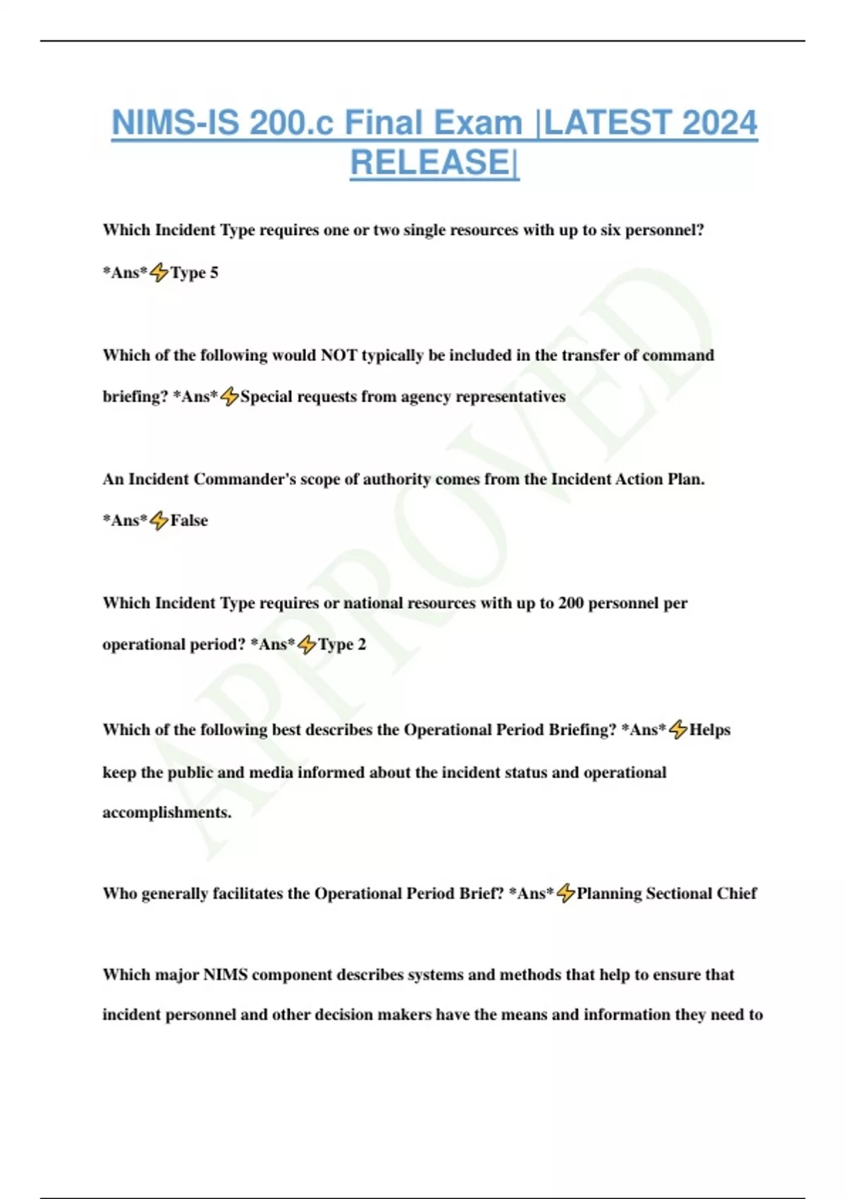 NIMS-IS 200.c Final Exam |LATEST 2024 RELEASE| Which Incident Type requires one or two single resources with up to six personnel? *Ans* Type 5 Which of the following would NOT typically be included in the transfer of command briefing? *Ans* Special requests from agency representatives An Incident Commander's scope of authority comes from the Incident Action Plan. *Ans* False Which Incident Type requires or national resources with up to 200 personnel per operational period? *Ans* Type 2 Which of the following best describes the Operational Period Briefing? *Ans* Helps keep the public and media informed about the incident status and operational accomplishments. Who generally facilitates the Operational Period Brief? *Ans* Planning Sectional Chief Which major NIMS component describes systems and methods that help to ensure that incident personnel and other decision makers have the means and information they need to make and communicate decisions? *Ans* Communications and Information Managemen