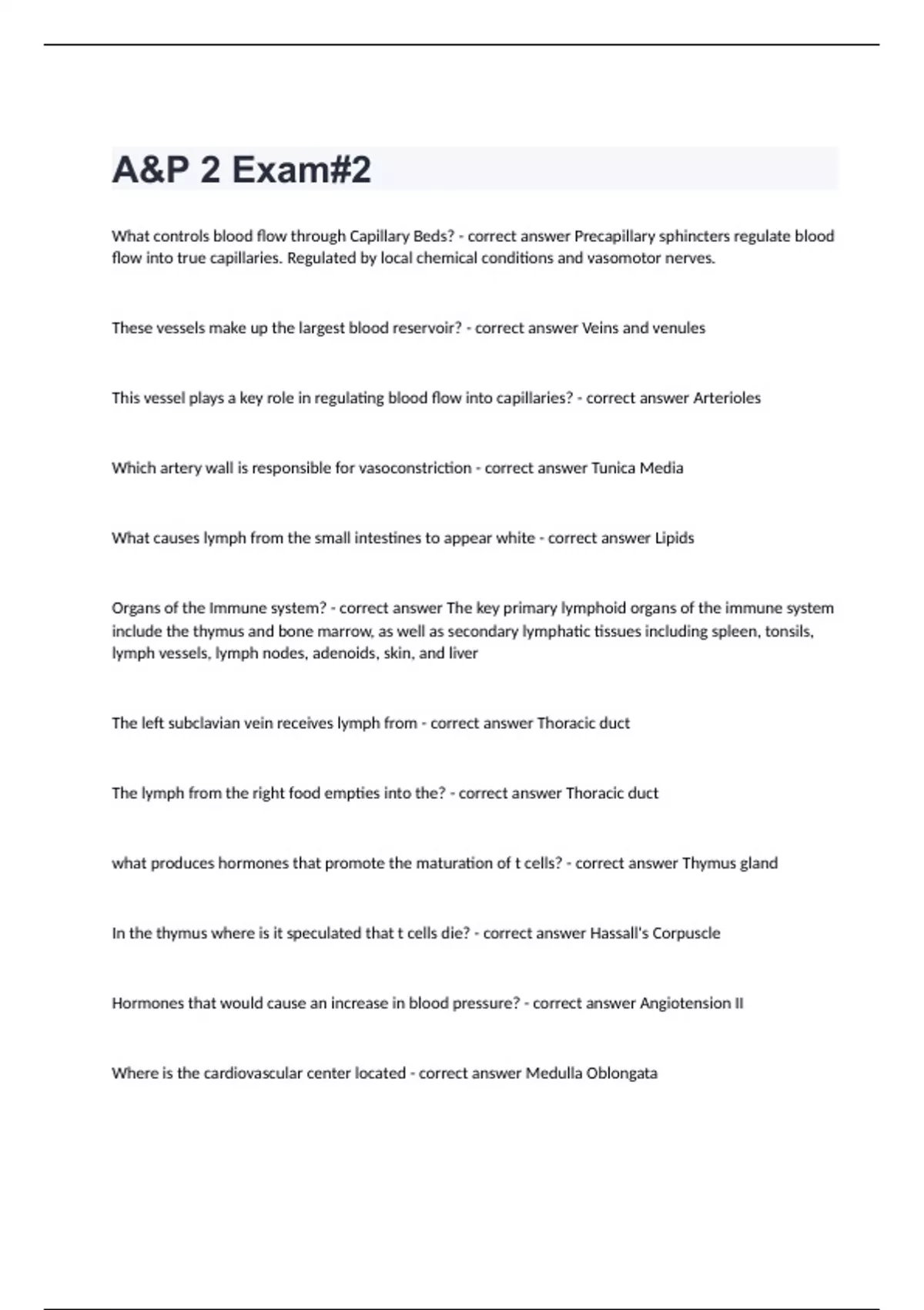 A&P 2 Exam#2 Question and answers correctly solved A&P 2 Exam#2 What controls blood flow through Capillary Beds? - correct answer Precapillary sphincters regulate blood flow into true capillaries. Regulated by local chemical conditions and vasomotor nerves. These vessels make up the largest blood reservoir? - correct answer Veins and venules This vessel plays a key role in regulating blood flow into capillaries? - correct answer Arterioles Which artery wall is responsible for vasoconstriction - correct answer Tunica Media What causes lymph from the small intestines to appear white - correct answer Lipids Organs of the Immune system? - correct answer The key primary lymphoid organs of the immune system include the thymus and bone marrow, as well as secondary lymphatic tissues including spleen, tonsils, lymph vessels, lymph nodes, adenoids, skin, and liver The left subclavian vein receives lymph from - correct answer Thoracic duct The lymph from the right food empties into the? - correct answer Thoracic duct what produces hormones that promote the maturation of t cells? - correct answer Thymus gland In the thymus where is it speculated that t cells die? - correct answer Hassall's Corpuscle Hormones that would cause an increase in blood pressure? - correct answer Angiotension II