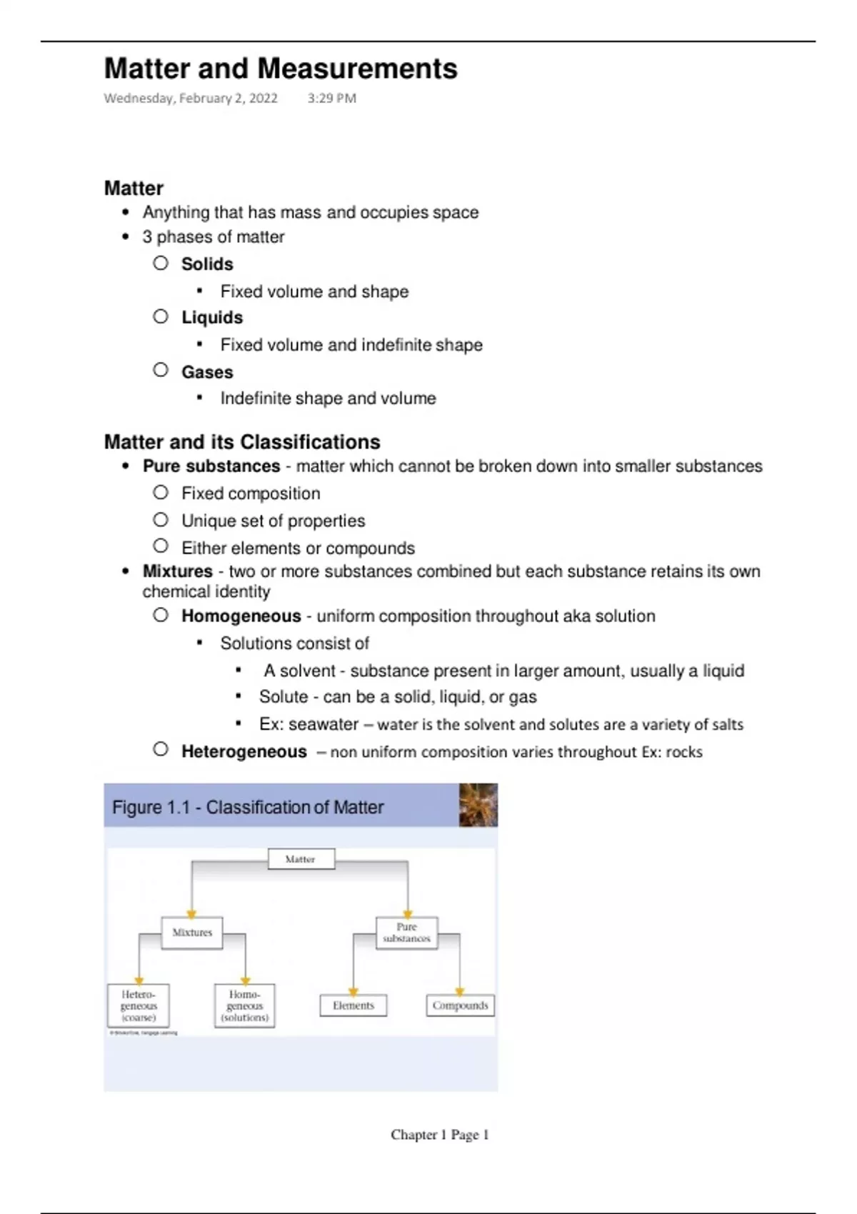Chemistry notes Chapter 1: matter, elements, atomic symbols, mixtures, chromatography, metric system units of measurement, length, volume, mass, temperature, significant figures, converting units, conversion factors, properties of substances, density & solubility.