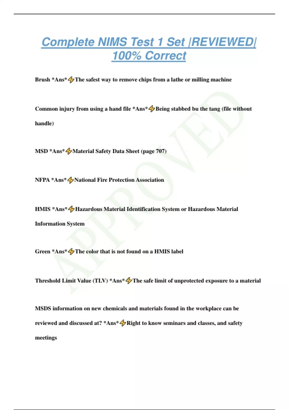 Complete NIMS Test 1 Set |REVIEWED| 100% Correct Brush *Ans* The safest way to remove chips from a lathe or milling machine Common injury from using a hand file *Ans* Being stabbed bu the tang (file without handle) MSD *Ans* Material Safety Data Sheet (page 707) NFPA *Ans* National Fire Protection Association HMIS *Ans* Hazardous Material Identification System or Hazardous Material Information System Green *Ans* The color that is not found on a HMIS label Threshold Limit Value (TLV) *Ans* The safe limit of unprotected exposure to a material MSDS information on new chemicals and materials found in the workplace can be reviewed and discussed at? *Ans* Right to know seminars and classes, and safety meetings Occupational Safety and Health Administration (OSHA) *Ans* The acronym for the government agency that regulates safety Why are shops towels or oily rags stored in a red fireproof can with a lid? *Ans* To prevent fires through spontaneous combustion What is the first course of action for when a material (solid) becomes lodged in the eye? *Ans* Pull the top lid over the bottom lid Stop bleeding by applying pressure to the wound *Ans* The first action to take with a bleeding wound Lift with the legs and keep back straight *Ans* The best technique for lifting What can happen while operating the lathe with long hair, dangling jewelry, or loose clothing? *Ans* Operator can be pulled toward the machine if anything is caught When working on material stored overhead using cranes or hoists, government safety regulations state that a person must? *Ans* Wear a hard hat