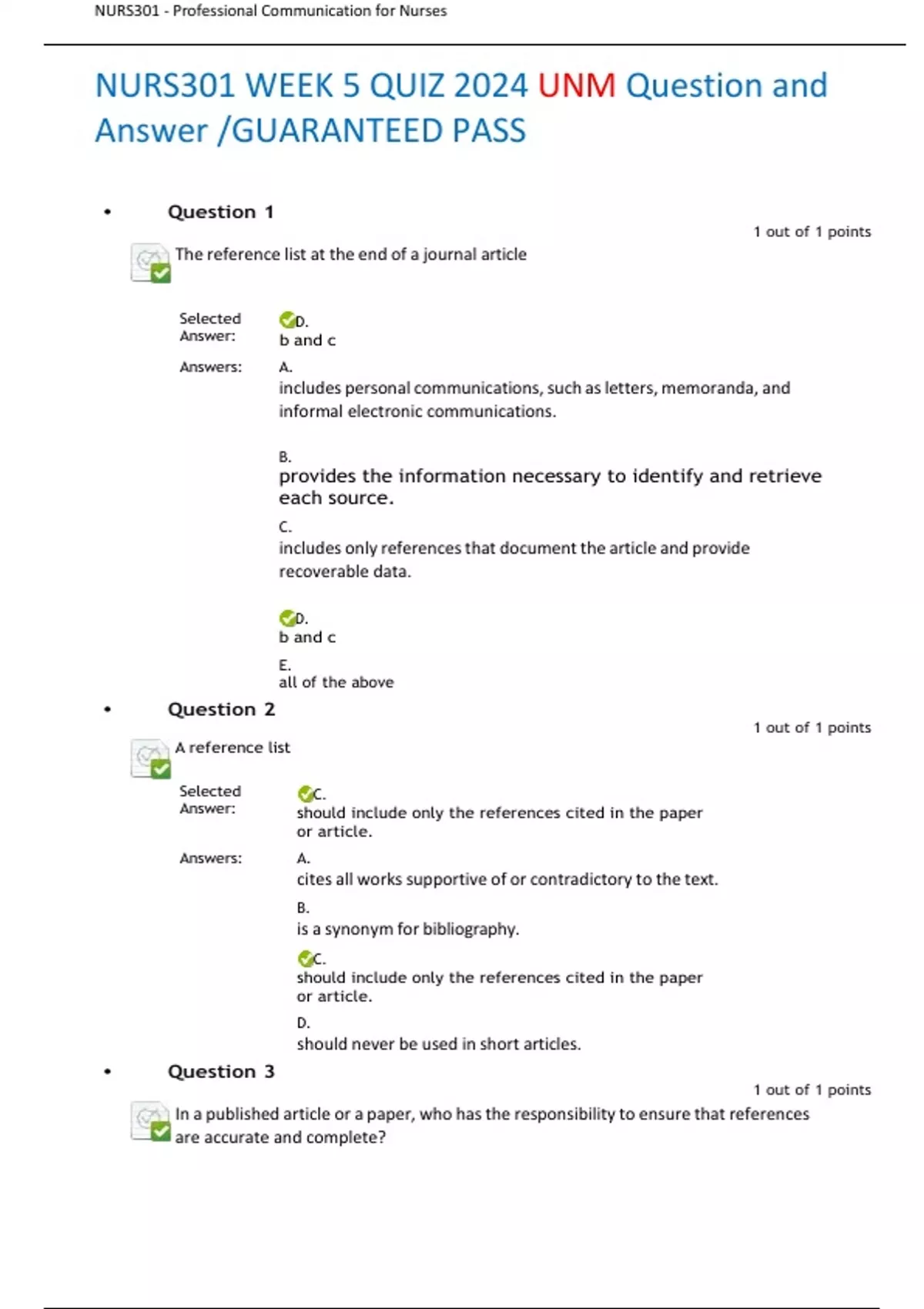 NURS301 WEEK 5 QUIZ 2024 UNM Question and Answer GUARANTEED PASS
