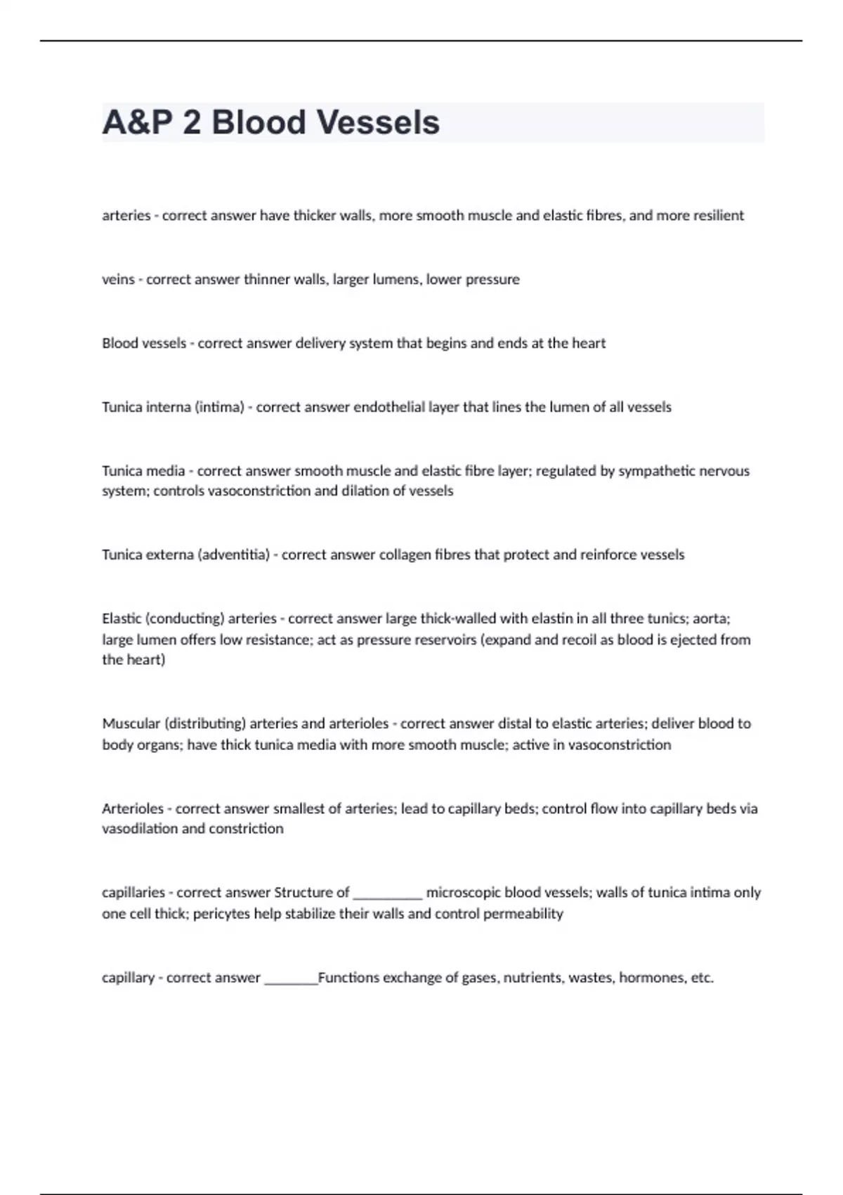 A&P 2 Blood Vessels Question and answers verified to passA&P 2 Blood Vessels arteries - correct answer have thicker walls, more smooth muscle and elastic fibres, and more resilient veins - correct answer thinner walls, larger lumens, lower pressure Blood vessels - correct answer delivery system that begins and ends at the heart Tunica interna (intima) - correct answer endothelial layer that lines the lumen of all vessels Tunica media - correct answer smooth muscle and elastic fibre layer; regulated by sympathetic nervous system; controls vasoconstriction and dilation of vessels Tunica externa (adventitia) - correct answer collagen fibres that protect and reinforce vessels Elastic (conducting) arteries - correct answer large thick-walled with elastin in all three tunics; aorta; large lumen offers low resistance; act as pressure reservoirs (expand and recoil as blood is ejected from the heart) Muscular (distributing) arteries and arterioles - correct answer distal to elastic arteries; deliver blood to body organs; have thick tunica media with more smooth muscle; active in vasoconstriction Arterioles - correct answer smallest of arteries; lead to capillary beds; control flow into capillary beds via vasodilation and constriction capillaries - correct answer Structure of