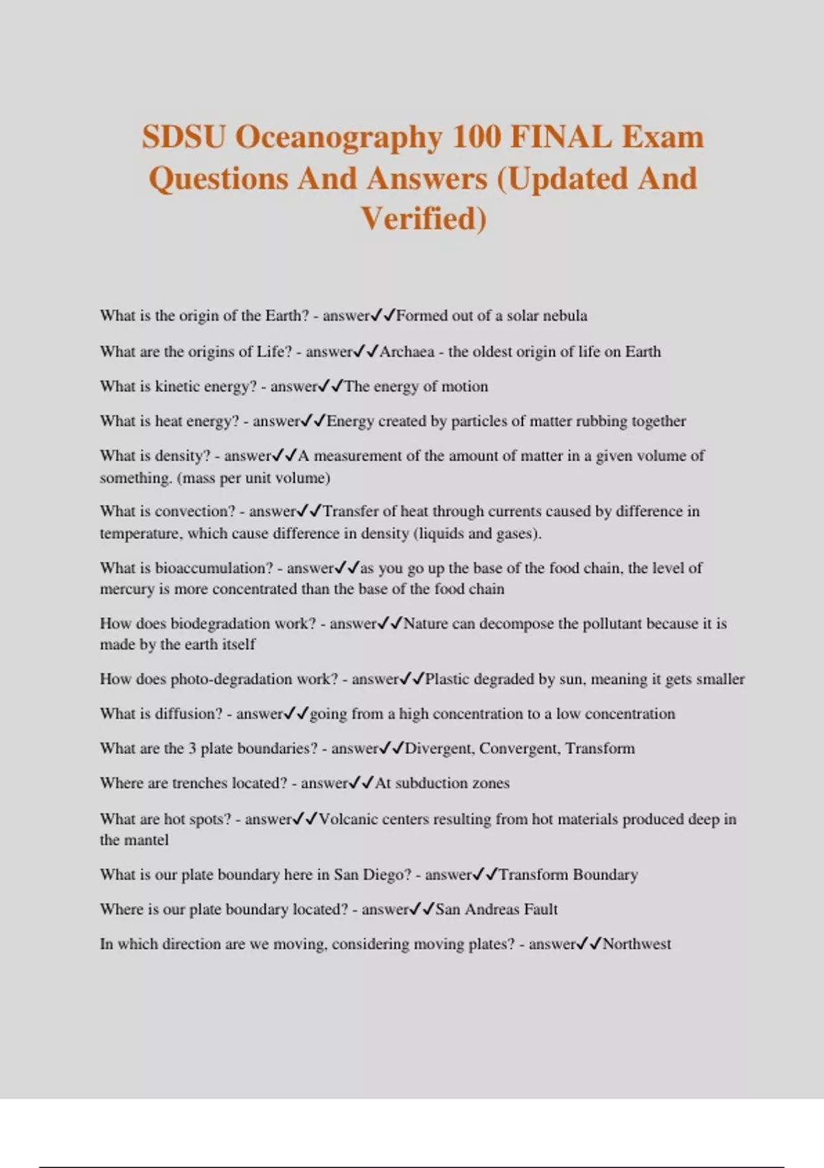 SDSU Oceanography 100 FINAL Exam Questions And Answers (Updated And Verified)